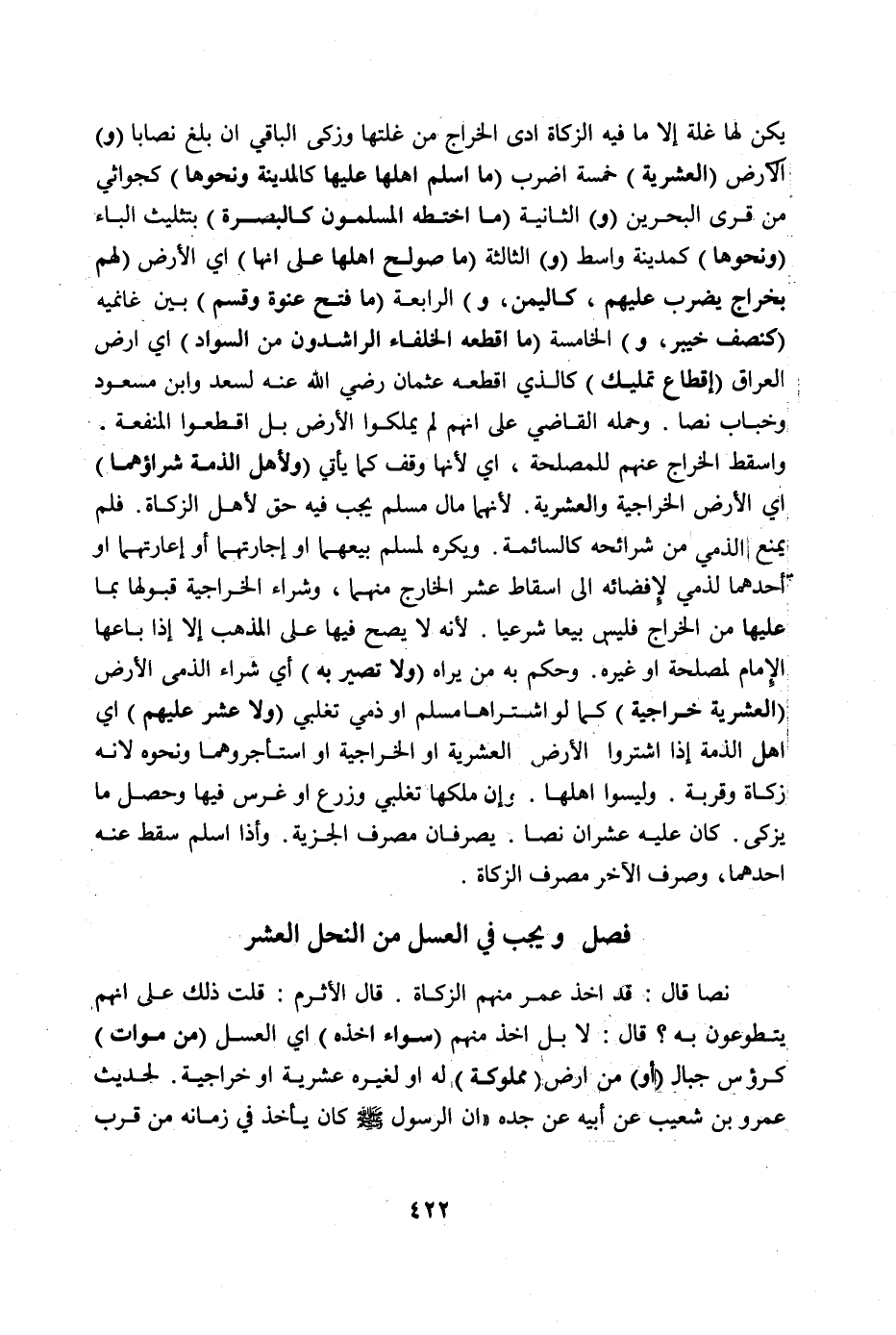 فَصْلٌ وَيَجِبُ فِي الْعَسَلِ مِنْ النَّحْلِ الْعُشْرُ نَصًّا قَالَ: قَدْ أَخَذَ عُمَرُ مِنْهُمْ الزَّكَاةَ. قَالَ الْأَثْرَمُ: قُلْت ذَلِكَ عَلَى أَنَّهُمْ يَتَطَوَّعُونَ بِهِ؟ قَالَ: لَا بَلْ أَخَذَ مِنْهُمْ (سَوَاءٌ أَخَذَهُ) أَيْ: الْعَسَلَ (مِنْ مَوَاتٍ) كَرُؤْسِ جِبَالٍ (أَوْ) مِنْ أَرْضٍ (مَمْلُوكَةٍ) لَهُ أَوْ لِغَيْرِهِ عُشْرِيَّةٍ أَوْ خَرَاجِيَّةً. لِحَدِيثِ عَمْرِو بْنِ شُعَيْبٍ عَنْ أَبِيهِ عَنْ جَدِّهِ