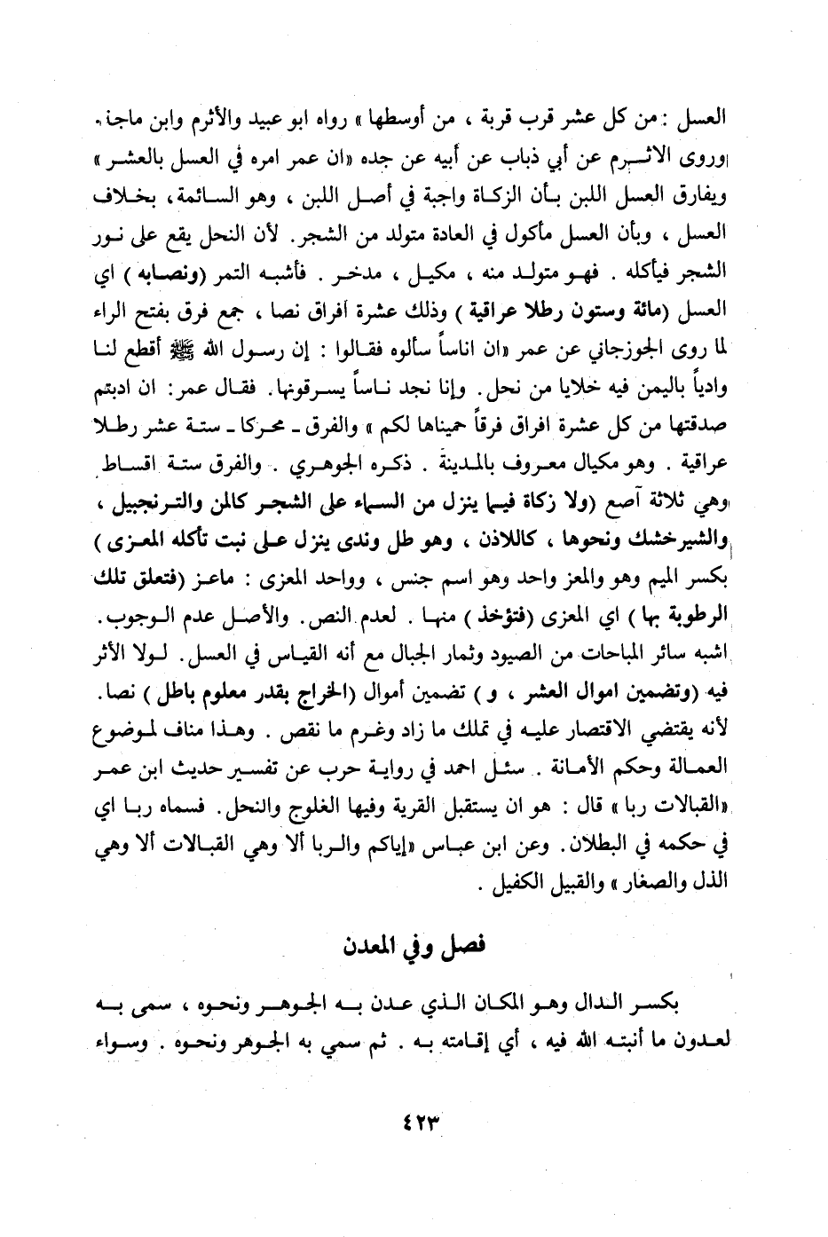 «أَنَّ الرَّسُولَ صَلَّى اللَّهُ عَلَيْهِ وَسَلَّمَ كَانَ يَأْخُذُ فِي زَمَانِهِ مِنْ قِرَبِ الْعَسَلِ: مِنْ كُلِّ عَشْرِ قِرَبٍ قِرْبَةً، مِنْ أَوْسَطِهَا» رَوَاهُ أَبُو عُبَيْدٍ وَالْأَثْرَمُ وَابْنُ مَاجَهْ.