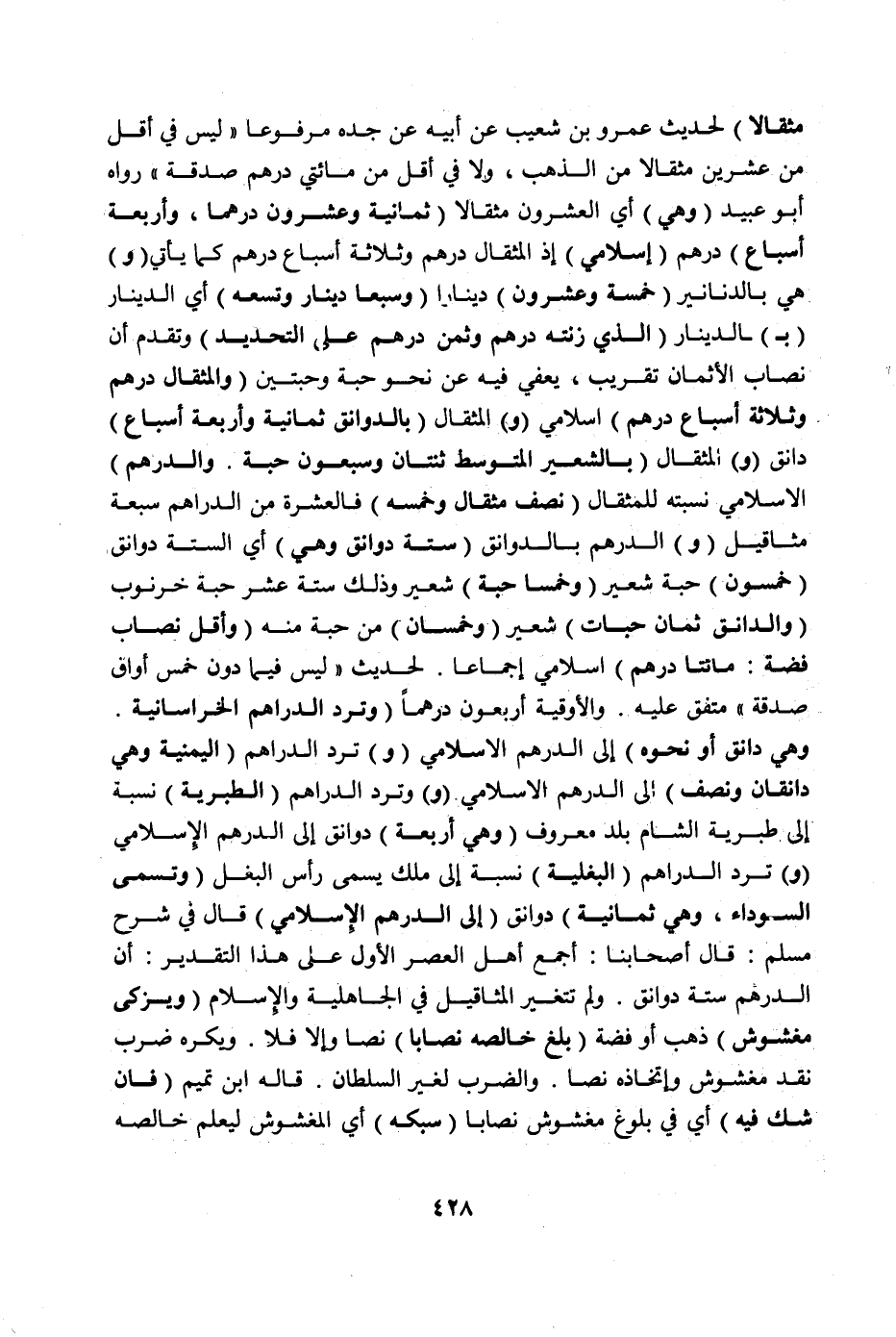 مِثْقَالًا) لِحَدِيثِ عَمْرِو بْنِ شُعَيْبٍ عَنْ أَبِيهِ عَنْ جَدِّهِ مَرْفُوعًا «لَيْسَ فِي أَقَلَّ مِنْ عِشْرِينَ مِثْقَالًا مِنْ الذَّهَبِ، وَلَا فِي أَقَلَّ مِنْ مِائَتَيْ دِرْهَمٍ صَدَقَةٌ» رَوَاهُ أَبُو عُبَيْدٍ (وَهِيَ) أَيْ الْعِشْرُونَ مِثْقَالًا (ثَمَانِيَةٌ وَعِشْرُونَ دِرْهَمًا، وَأَرْبَعَةُ أَسْبَاعِ) دِرْهَمٍ (إسْلَامِيٍّ) إذْ الْمِثْقَالُ دِرْهَمٌ وَثَلَاثَةُ أَسْبَاعِ دِرْهَمٍ كَمَا يَأْتِي (وَ) هِيَ بِالدَّنَانِيرِ (خَمْسَةٌ وَعِشْرُونَ) دِينَارًا (وَسُبْعَا دِينَارٍ وَتُسْعُهُ) أَيْ: الدِّينَارِ (ب) الدِّينَارِ (الَّذِي زِنَتُهُ دِرْهَمٌ وَثُمْنُ دِرْهَمٍ عَلَى التَّحْدِيدِ) وَتَقَدَّمَ أَنَّ نِصَابَ الْأَثْمَانِ تَقْرِيبٌ، يُعْفَى فِيهِ عَنْ نَحْوِ حَبَّةٍ وَحَبَّتَيْنِ (وَالْمِثْقَالُ دِرْهَمٌ وَثَلَاثَةُ أَسْبَاعِ دِرْهَمٍ) إسْلَامِيٍّ (وَ) الْمِثْقَالُ (بِالدَّوَانِقِ ثَمَانِيَةٌ وَأَرْبَعَةُ أَسْبَاعِ) دَانِقٍ (وَ) الْمِثْقَالُ (بِالشَّعِيرِ الْمُتَوَسِّطِ ثِنْتَانِ وَسَبْعُونَ حَبَّةً، وَالدِّرْهَمُ) الْإِسْلَامِيُّ نِسْبَتُهُ لِلْمِثْقَالِ (نِصْفُ مِثْقَالٍ وَخُمْسُهُ) فَالْعَشَرَةُ مِنْ الدَّرَاهِمِ سَبْعَةُ مَثَاقِيلَ (وَ) الدِّرْهَمُ بِالدَّوَانِقِ (سِتَّةُ دَوَانِقَ وَهِيَ) أَيْ السِّتَّةُ دَوَانِقَ (خَمْسُونَ) حَبَّةَ شَعِيرٍ (وَخُمْسَا حَبَّةِ) شَعِيرٍ وَذَلِكَ سِتَّةَ عَشَرَ حَبَّةَ خُرْنُوبٍ (وَالدَّانِقُ ثَمَانِ حَبَّاتِ) شَعِيرٍ (وَخُمْسَانِ) مِنْ حَبَّةٍ مِنْهُ.