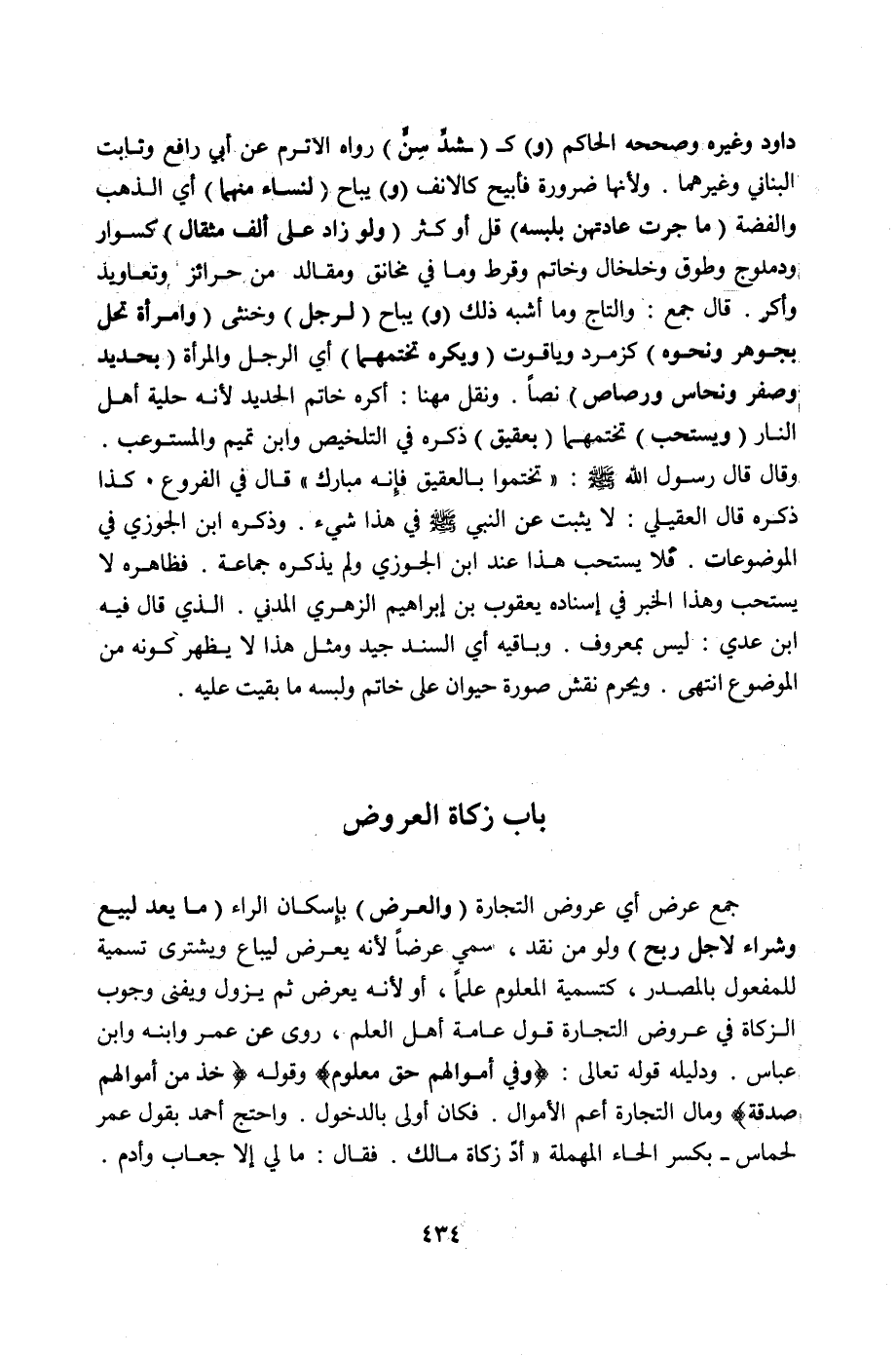 ِ جَمْعُ عَرْضٍ أَيْ: عُرُوضِ التِّجَارَةِ (وَالْعَرْضُ) بِإِسْكَانِ الرَّاءِ (مَا يُعَدُّ لِبَيْعٍ وَشِرَاءٍ لِأَجْلِ رِبْحٍ) وَلَوْ مِنْ نَقْدٍ، سُمِّيَ عَرْضًا لِأَنَّهُ يُعْرَضُ لِيُبَاعَ وَيُشْتَرَى تَسْمِيَةً لِلْمَفْعُولِ بِالْمَصْدَرِ، كَتَسْمِيَةِ الْمَعْلُومِ عِلْمًا، أَوْ لِأَنَّهُ يُعْرَضُ ثُمَّ يَزُولُ وَيَفْنَى وُجُوبُ الزَّكَاةِ فِي عُرُوضِ التِّجَارَةِ قَوْلُ عَامَّةِ أَهْلِ الْعِلْمِ، رُوِيَ عَنْ عُمَرَ وَابْنِهِ وَابْنِ عَبَّاسٍ. وَدَلِيلُهُ قَوْله تَعَالَى: {وَفِي أَمْوَالِهِمْ حَقٌّ مَعْلُومٌ} [المعارج: ٢٤] وَقَوْلُهُ {خُذْ مِنْ أَمْوَالِهِمْ صَدَقَةً} [التوبة: ١٠٣] وَمَالُ التِّجَارَةِ أَعَمُّ الْأَمْوَالِ، فَكَانَ أَوْلَى بِالدُّخُولِ.