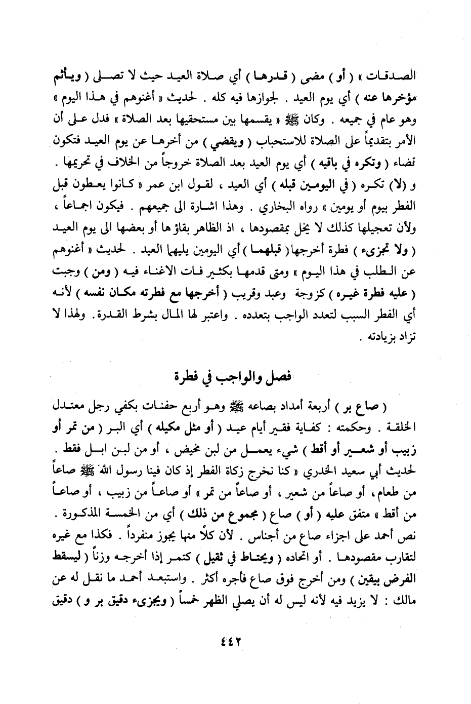 فَصْلٌ وَالْوَاجِبُ فِي فِطْرَةٍ (صَاعُ بُرٍّ) أَرْبَعَةُ أَمْدَادٍ بِصَاعِهِ صَلَّى اللَّهُ عَلَيْهِ وَسَلَّمَ وَهُوَ أَرْبَعُ حَفَنَاتٍ بِكَفَّيْ رَجُلٍ مُعْتَدِلِ الْخِلْقَةِ، وَحِكْمَتُهُ: كِفَايَةُ فَقِيرٍ أَيَّامَ عِيدٍ (أَوْ مِثْلُ مَكِيلِهِ) أَيْ الْبُرِّ (مِنْ تَمْرٍ أَوْ زَبِيبٍ أَوْ شَعِيرٍ أَوْ أَقِطٍ) شَيْءٌ يُعْمَلُ مِنْ لَبَنٍ مَخِيضٍ، أَوْ مِنْ لَبَنِ إبِلٍ فَقَطْ لِحَدِيثِ أَبِي سَعِيدٍ الْخُدْرِيِّ «كُنَّا نُخْرِجُ زَكَاةَ الْفِطْرِ إذْ كَانَ فِينَا رَسُولُ اللَّهِ صَلَّى اللَّهُ عَلَيْهِ وَسَلَّمَ صَاعًا مِنْ طَعَامٍ، أَوْ صَاعًا مِنْ شَعِيرٍ، أَوْ صَاعًا مِنْ تَمْرٍ أَوْ صَاعًا مِنْ زَبِيبٍ، أَوْ صَاعًا مِنْ أَقِطٍ» مُتَّفَقٌ عَلَيْهِ (أَوْ) صَاعٍ (مَجْمُوعٍ مِنْ ذَلِكَ) أَيْ: مِنْ الْخَمْسَةِ الْمَذْكُورَةِ. نَصَّ أَحْمَدُ عَلَى إجْزَاءِ صَاعٍ مِنْ أَجْنَاسٍ ; لِأَنَّ كُلًّا مِنْهَا يَجُوزُ مُنْفَرِدًا، فَكَذَا مَعَ غَيْرِهِ لِتَقَارُبِ مَقْصُودِهَا، أَوْ اتِّحَادِهِ (وَيُحْتَاطُ فِي ثَقِيلٍ) كَتَمْرٍ إذَا أَخْرَجَهُ وَزْنًا (لِيَسْقُطَ الْفَرْضُ بِيَقِينٍ) وَمَنْ أَخْرَجَ فَوْقَ صَاعٍ فَأَجْرُهُ أَكْثَرُ وَاسْتَبْعَدَ أَحْمَدُ مَا نُقِلَ لَهُ عَنْ مَالِكٍ: لَا يَزِيدُ فِيهِ لِأَنَّهُ لَيْسَ لَهُ أَنْ يُصَلِّيَ الظُّهْرَ خَمْسًا.