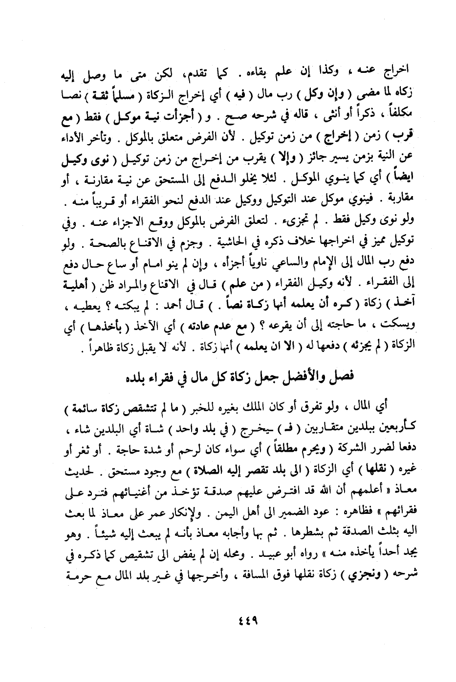 فَصْلٌ وَالْأَفْضَلُ جَعْلُ زَكَاةِ كُلِّ مَالٍ فِي فُقَرَاءِ بَلَدِهِ أَيْ: الْمَالِ، وَلَوْ تَفَرَّقَ أَوْ كَانَ الْمِلْكُ بِغَيْرِهِ لِلْخَبَرِ (مَا لَمْ تَتَشَقَّصْ زَكَاةُ سَائِمَةٍ) كَأَرْبَعِينَ بِبَلَدَيْنِ مُتَقَارِبَيْنِ (فَ) يُخْرِجُ (فِي بَلَدٍ وَاحِدٍ) شَاةً أَيَّ الْبَلَدَيْنِ شَاءَ، دَفْعًا لِضَرَرِ الشَّرِكَةِ (وَيَحْرُمُ مُطْلَقًا) أَيْ: سَوَاءٌ كَانَ لِرَحِمٍ أَوْ شِدَّةِ حَاجَةٍ أَوْ ثَغْرٍ أَوْ غَيْرِهِ (نَقَلَهَا) أَيْ: الزَّكَاةَ (إلَى بَلَدٍ تُقْصَرُ إلَيْهِ الصَّلَاةُ) مَعَ وُجُودِ مُسْتَحِقٍّ لِحَدِيثِ مُعَاذٍ «أَعْلِمْهُمْ أَنَّ اللَّهَ قَدْ افْتَرَضَ عَلَيْهِمْ صَدَقَةً تُؤْخَذُ مِنْ أَغْنِيَائِهِمْ فَتُرَدُّ عَلَى فُقَرَائِهِمْ» فَظَاهِرُهُ: عَوْدُ الضَّمِيرِ إلَى أَهْلِ الْيَمَنِ. وَلِإِنْكَارِ عُمَرَ عَلَى مُعَاذٍ لَمَّا بَعَثَ إلَيْهِ بِثُلُثِ الصَّدَقَةِ ثُمَّ بِشَطْرِهَا ثُمَّ بِهَا وَأَجَابَهُ مُعَاذٌ بِأَنَّهُ لَمْ يَبْعَثْ إلَيْهِ شَيْئًا وَهُوَ يَجِدُ أَحَدًا يَأْخُذُهُ مِنْهُ " رَوَاهُ أَبُو عُبَيْدٍ، وَمَحَلُّهُ إنْ لَمْ يُفْضِ إلَى تَشْقِيصٍ كَمَا ذَكَرَهُ فِي شَرْحِهِ.