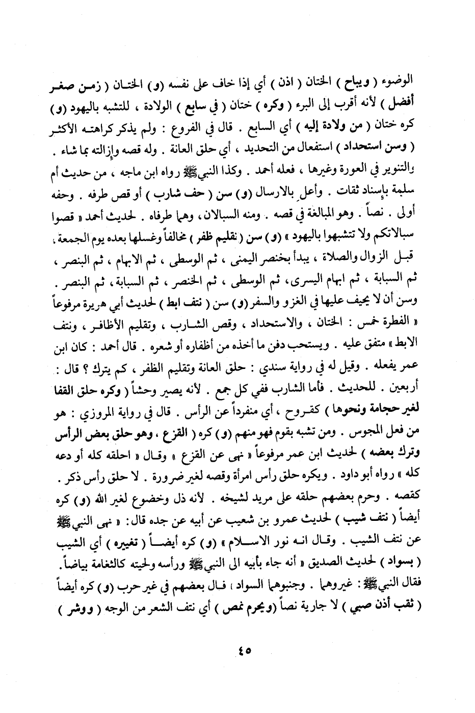 (وَكُرِهَ حَلْقُ الْقَفَا لِغَيْرِ حِجَامَةٍ وَنَحْوِهَا) كَقُرُوحٍ، أَيْ: مُنْفَرِدًا عَنْ الرَّأْسِ قَالَ فِي رِوَايَةِ الْمَرْوَزِيِّ: هُوَ مِنْ فِعْلِ الْمَجُوسِ. وَمَنْ تَشَبَّهَ بِقَوْمٍ فَهُوَ مِنْهُمْ.