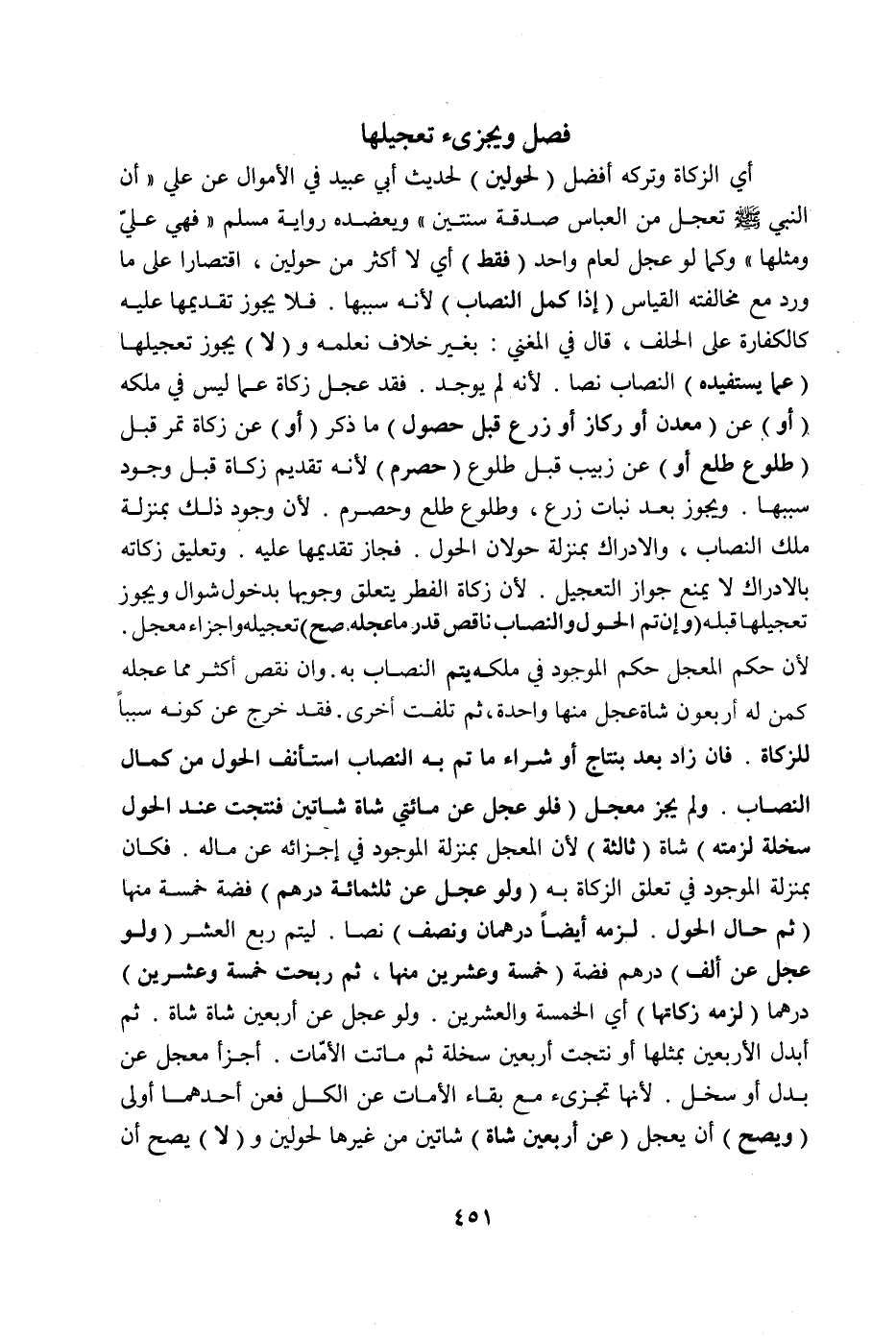 فَصْلٌ وَيُجْزِئُ تَعْجِيلُهَا أَيْ: الزَّكَاةِ وَتَرْكُهُ أَفْضَلُ (لِحَوْلَيْنِ) لِحَدِيثِ أَبِي عُبَيْدٍ فِي الْأَمْوَالِ عَنْ عَلِيٍّ «أَنَّ النَّبِيَّ صَلَّى اللَّهُ عَلَيْهِ وَسَلَّمَ تَعَجَّلَ مِنْ الْعَبَّاسِ صَدَقَةَ سَنَتَيْنِ» وَيُعَضِّدُهُ رِوَايَةُ مُسْلِمٍ «فَهِيَ عَلَيَّ وَمِثْلُهَا» وَكَمَا لَوْ عَجَّلَ لِعَامٍ وَاحِدٍ (فَقَطْ) أَيْ: لَا أَكْثَرَ مِنْ حَوْلَيْنِ، اقْتِصَارٌ عَلَى مَا وَرَدَ مَعَ مُخَالَفَتِهِ الْقِيَاسَ (إذَا كَمُلَ النِّصَابُ) لِأَنَّهُ سَبَبُهَا، فَلَا يَجُوزُ تَقْدِيمُهَا عَلَيْهِ كَالْكَفَّارَةِ عَلَى الْحَلِفِ، قَالَ فِي الْمُغْنِي: بِغَيْرِ خِلَافٍ نَعْلَمُهُ و (لَا) يَجُوزُ تَعْجِيلُهَا (عَمَّا يَسْتَفِيدُهُ) النِّصَابُ نَصًّا ; لِأَنَّهُ لَمْ يُوجَدْ، فَقَدْ عَجَّلَ زَكَاةً عَمَّا لَيْسَ فِي مِلْكِهِ (أَوْ) عَنْ (مَعْدِنٍ أَوْ رِكَازٍ أَوْ زَرْعٍ قَبْلَ حُصُولِ) مَا ذَكَرَ (أَوْ) عَنْ زَكَاةِ تَمْرٍ قَبْلَ (طُلُوعِ طَلْعٍ أَوْ) عَنْ زَبِيبٍ قَبْلَ طُلُوعِ (حِصْرِمٍ) لِأَنَّهُ تَقْدِيمُ زَكَاةٍ قَبْلَ وُجُودِ سَبَبِهَا وَيَجُوزُ بَعْدَ نَبَاتِ زَرْعٍ، وَطُلُوعِ طَلْعٍ وَحِصْرِمٍ ; لِأَنَّ وُجُودَ ذَلِكَ بِمُنْزِلَةِ مِلْكِ النِّصَابِ، وَالْإِدْرَاكُ بِمَنْزِلَةِ حَوَلَانِ الْحَوْلِ، فَجَازَ تَقْدِيمُهَا عَلَيْهِ. وَتَعْلِيقُ زَكَاتِهِ بِالْإِدْرَاكِ لَا يَمْنَعُ جَوَازَ التَّعْجِيلِ ; لِأَنَّ زَكَاةَ الْفِطْرِ يَتَعَلَّقُ وُجُوبُهَا بِدُخُولِ شَوَّالٍ وَيَجُوزُ تَعْجِيلُهَا قَبْلَهُ.