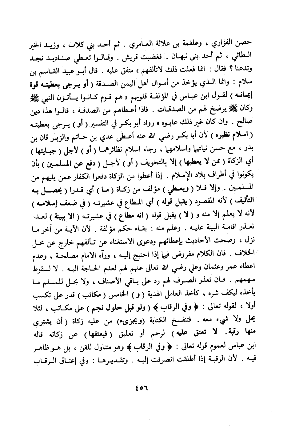 قَالَ أَبُو عُبَيْدٍ الْقَاسِمُ بْنُ سَلَّامٍ: وَإِنَّمَا الَّذِي يُؤْخَذُ مِنْ أَمْوَالِ أَهْلِ الْيَمَنِ الصَّدَقَةُ (أَوْ يُرْجَى بِعَطِيَّتِهِ قُوَّةُ إيمَانِهِ) لِقَوْلِ ابْنِ عَبَّاسٍ فِي الْمُؤَلَّفَةِ قُلُوبُهُمْ «هُمْ قَوْمٌ كَانُوا يَأْتُونَ النَّبِيَّ صَلَّى اللَّهُ عَلَيْهِ وَسَلَّمَ وَكَانَ صَلَّى اللَّهُ عَلَيْهِ وَسَلَّمَ يَرْضَخُ لَهُمْ مِنْ الصَّدَقَاتِ فَإِذَا أَعْطَاهُمْ مِنْ الصَّدَقَةِ، قَالُوا هَذَا دِينٌ صَالِحٌ وَإِنْ كَانَ غَيْرَ ذَلِكَ عَابُوهُ» رَوَاهُ أَبُو بَكْرٍ فِي التَّفْسِيرِ (أَوْ) يُرْجَى بِعَطِيَّتِهِ (إسْلَامُ نَظِيرِهِ) لِأَنَّ أَبَا بَكْرٍ رَضِيَ اللَّهُ عَنْهُ أَعْطَى عَدِيَّ بْنَ حَاتِمٍ وَالزِّبْرِقَانَ بْنَ بَدْرٍ، مَعَ حُسْنِ نِيَّاتِهِمَا وَإِسْلَامِهِمَا، رَجَاءَ إسْلَامِ نَظَائِرِهِمَا (أَوْ) لِأَجْلِ (جِبَايَتِهَا) أَيْ: الزَّكَاةِ (مِمَّنْ لَا يُعْطِيهَا) إلَّا بِالتَّخْوِيفِ (أَوْ) لِأَجْلِ (دَفْعٍ عَنْ الْمُسْلِمِينَ) بِأَنْ يَكُونُوا فِي أَطْرَافِ بِلَادِ الْإِسْلَامِ، إذَا أُعْطُوا مِنْ الزَّكَاةِ دَفَعُوا الْكُفَّارَ عَمَّنْ يَلِيهِمْ مِنْ الْمُسْلِمِينَ، وَإِلَّا فَلَا.