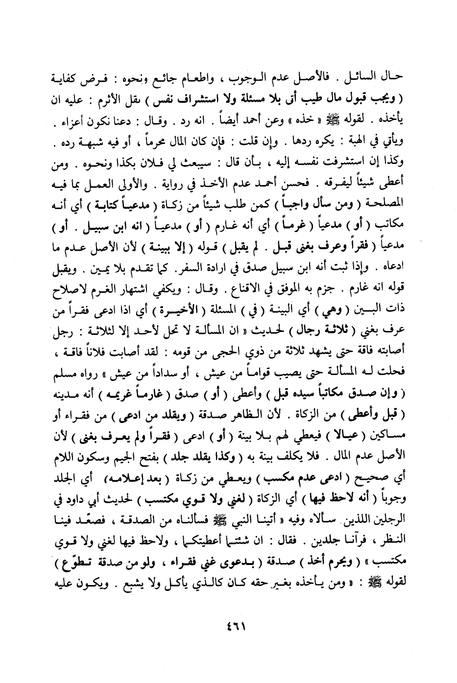(وَمَنْ سَأَلَ وَاجِبًا) كَمَنْ طَلَبَ شَيْئًا مِنْ زَكَاةٍ (مُدَّعِيًا كِتَابَةً) أَيْ: أَنَّهُ مُكَاتَبٌ (أَوْ) مُدَّعِيًا (غُرْمًا) أَيْ: أَنَّهُ غَارِمٌ (أَوْ) مُدَّعِيًا (أَنَّهُ ابْنُ سَبِيلٍ. أَوْ) مُدَّعِيًا (فَقْرًا وَعُرِفَ بِغِنًى قَبْلُ لَمْ يُقْبَلْ) قَوْلُهُ (إلَّا بِبَيِّنَةٍ) لِأَنَّ الْأَصْلَ عَدَمُ مَا ادَّعَاهُ، وَإِذَا ثَبَتَ أَنَّهُ ابْنُ سَبِيلٍ صُدِّقَ فِي إرَادَةِ السَّفَرِ، كَمَا تَقَدَّمَ بِلَا يَمِينٍ، وَيُقْبَلُ قَوْلُ إنَّهُ غَارِمٌ، جَزَمَ بِهِ الْمُوَفَّقُ فِي الْإِقْنَاعِ، وَقَالَ: وَيَكْفِي اشْتِهَارُ الْغُرْمِ لِإِصْلَاحِ ذَاتِ الْبَيْنِ (وَهِيَ) أَيْ: الْبَيِّنَةُ (فِي) الْمَسْأَلَةِ (الْأَخِيرَةِ) أَيْ: إذَا ادَّعَى فَقْرًا مَنْ عُرِفَ بِغِنًى (ثَلَاثَةُ رِجَالٍ) لِحَدِيثِ «إنَّ الْمَسْأَلَةَ لَا تَحِلُّ لِأَحَدٍ إلَّا لِثَلَاثَةٍ: رَجُلٌ أَصَابَتْهُ فَاقَةٌ حَتَّى يَشْهَدَ ثَلَاثَةٌ مِنْ ذَوِي الْحِجَا مِنْ قَوْمِهِ: لَقَدْ أَصَابَتْ فُلَانًا فَاقَةٌ، فَحَلَّتْ لَهُ الْمَسْأَلَةُ حَتَّى يُصِيبَ قِوَامًا مِنْ عَيْشٍ، أَوْ سِدَادًا مِنْ عَيْشٍ» رَوَاهُ مُسْلِمٌ.
