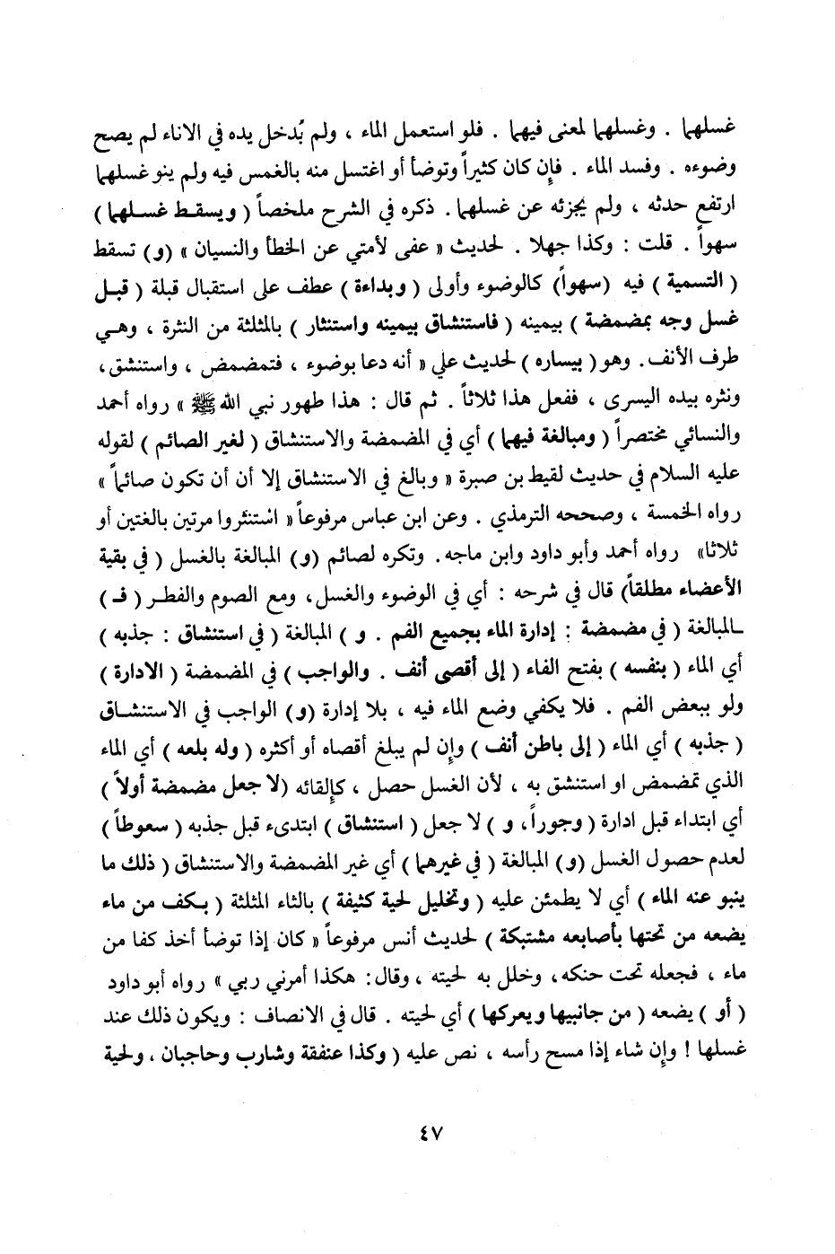 (وَمُبَالَغَةٍ فِيهِمَا) أَيْ: فِي الْمَضْمَضَة وَالِاسْتِنْشَاقِ (لِغَيْرِ الصَّائِمِ) لِقَوْلِهِ عَلَيْهِ السَّلَامُ فِي حَدِيثِ لَقِيطِ بْنِ صَبِرَةَ «وَبَالِغْ فِي الِاسْتِنْشَاقِ إلَّا أَنْ تَكُونَ صَائِمًا» رَوَاهُ الْخَمْسَةُ، وَصَحَّحَهُ التِّرْمِذِيُّ.