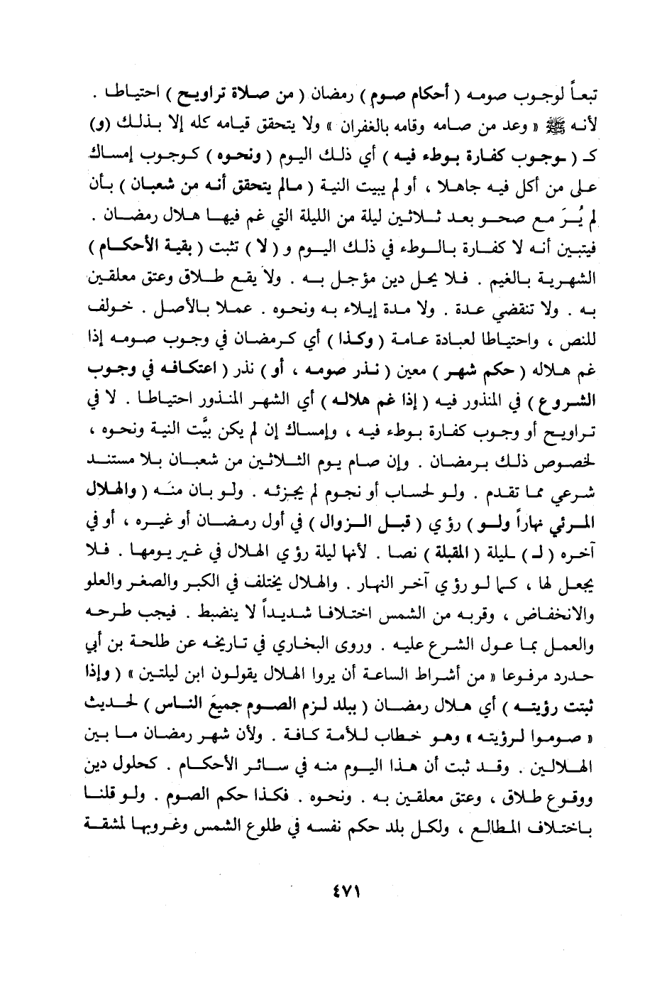 تَبَعًا لِوُجُوبِ صَوْمِهِ (أَحْكَامُ صَوْمِ) رَمَضَانَ (مِنْ صَلَاةِ تَرَاوِيحَ) احْتِيَاطًا ; لِأَنَّهُ صَلَّى اللَّهُ عَلَيْهِ وَسَلَّمَ " وَعَدَ مَنْ صَامَهُ وَقَامَهُ بِالْغُفْرَانِ " وَلَا يَتَحَقَّقُ قِيَامُهُ كُلُّهُ إلَّا بِذَلِكَ (وَ) كَ (وُجُوبِ كَفَّارَةٍ بِوَطْءٍ فِيهِ) أَيْ: ذَلِكَ الْيَوْمِ (وَنَحْوِهِ) كَوُجُوبِ إمْسَاكٍ عَلَى مَنْ أَكَلَ فِيهِ جَاهِلًا، أَوْ لَمْ يُبَيِّتْ النِّيَّةَ (مَا لَمْ يَتَحَقَّقُ أَنَّهُ مِنْ شَعْبَانَ) بِأَنْ لَمْ يُرَ مَعَ صَحْوٍ بَعْدَ ثَلَاثِينَ لَيْلَةً مِنْ اللَّيْلَةِ الَّتِي غَمَّ فِيهَا هِلَالُ رَمَضَانَ، فَيَتَبَيَّنُ أَنَّهُ لَا كَفَّارَةَ بِالْوَطْءِ فِي ذَلِكَ الْيَوْمِ و (لَا) تُثْبَتُ (بَقِيَّةُ الْأَحْكَامِ) الشَّهْرِيَّةِ بِالْغَيْمِ، فَلَا يَحِلُّ دَيْنٌ مُؤَجَّلٌ بِهِ، وَلَا يَقَعُ طَلَاقٌ وَعِتْقٌ مُعَلَّقَيْنِ بِهِ، وَلَا تَنْقَضِي عِدَّةٌ، وَلَا مُدَّةُ إيلَاءٍ بِهِ وَنَحْوِهِ عَمَلًا بِالْأَصْلِ، خُولِفَ لِلنَّصِّ، وَاحْتِيَاطًا لِعِبَادَةٍ عَامَّةٍ