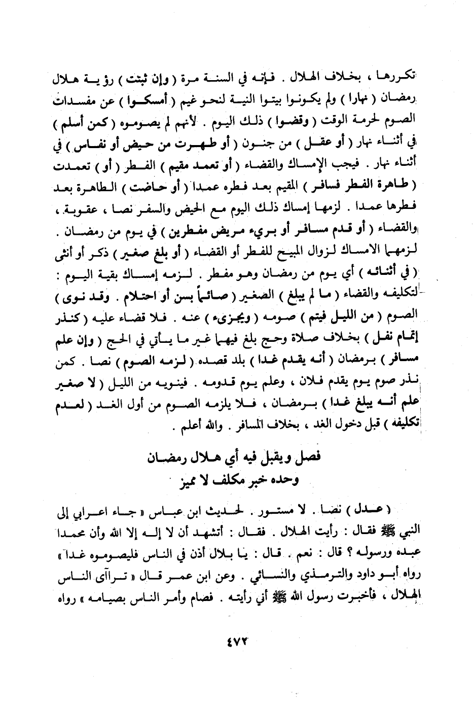 فَصْلٌ وَيُقْبَلُ فِيهِ أَيْ: هِلَالِ رَمَضَانَ وَحْدَهُ خَبَرُ مُكَلَّفٍ لَا مُمَيِّزٍ (عَدْلٍ) نَصًّا، لَا مَسْتُورٍ، لِحَدِيثِ ابْنِ عَبَّاسٍ «جَاءَ أَعْرَابِيٌّ إلَى النَّبِيِّ صَلَّى اللَّهُ عَلَيْهِ وَسَلَّمَ فَقَالَ: رَأَيْت الْهِلَالَ فَقَالَ: أَتَشْهَدُ أَنْ لَا إلَهَ إلَّا اللَّهُ وَأَنَّ مُحَمَّدًا عَبْدُهُ وَرَسُولُهُ؟ قَالَ: نَعَمْ، قَالَ: يَا بِلَالُ أَذِّنْ فِي النَّاسِ فَلْيَصُومُوهُ غَدًا» رَوَاهُ أَبُو دَاوُد وَالتِّرْمِذِيُّ وَالنَّسَائِيُّ.