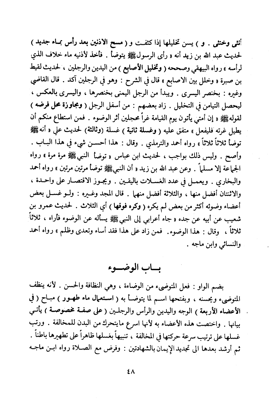 و (مَسْحُ الْأُذُنَيْنِ بَعْدَ رَأْسٍ بِمَاءٍ جَدِيدٍ) لِحَدِيثِ عَبْدِ اللَّهِ بْنِ زَيْدٍ أَنَّهُ «رَأَى الرَّسُولَ صَلَّى اللَّهُ عَلَيْهِ وَسَلَّمَ يَتَوَضَّأُ فَأَخَذَ لِأُذُنَيْهِ مَاءً خِلَافَ الَّذِي لِرَأْسِهِ» رَوَاهُ الْبَيْهَقِيُّ وَصَحَّحَهُ (وَتَخْلِيلُ الْأَصَابِعِ) مِنْ الْيَدَيْنِ وَالرِّجْلَيْنِ، لِحَدِيثِ لَقِيطِ بْنِ صَبِرَةَ «وَخَلِّلْ بَيْنَ الْأَصَابِعِ» .