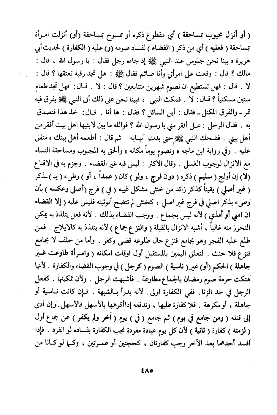 (وَ) عَلَيْهِ (الْكَفَّارَةُ) لِحَدِيثِ أَبِي هُرَيْرَةَ «بَيْنَا نَحْنُ جُلُوسٌ عِنْدَ النَّبِيِّ صَلَّى اللَّهُ عَلَيْهِ وَسَلَّمَ إذْ جَاءَهُ رَجُلٌ فَقَالَ: يَا رَسُولَ اللَّهِ، قَالَ: مَا لَكَ؟ قَالَ: وَقَعْت عَلَى امْرَأَتِي وَأَنَا صَائِمٌ فَقَالَ صَلَّى اللَّهُ عَلَيْهِ وَسَلَّمَ: هَلْ تَجِدُ رَقَبَةً تُعْتِقُهَا؟ قَالَ: لَا قَالَ: فَهَلْ تَسْتَطِيعُ أَنْ تَصُومَ شَهْرَيْنِ مُتَتَابِعَيْنِ؟ قَالَ: لَا قَالَ: فَهَلْ تَجِدُ طَعَامَ سِتِّينَ مِسْكِينًا؟ قَالَ: لَا فَمَكَثَ النَّبِيُّ، فَبَيْنَا نَحْنُ عَلَى ذَلِكَ أَتَى النَّبِيُّ صَلَّى اللَّهُ عَلَيْهِ وَسَلَّمَ بِفَرْقٍ فِيهِ تَمْرٌ - وَالْفَرْقُ الْمِكْتَلُ - فَقَالَ: أَيْنَ السَّائِلُ؟ فَقَالَ: هَا أَنَا قَالَ: خُذْ هَذَا فَتَصَدَّقْ بِهِ فَقَالَ الرَّجُلُ: عَلَى أَفْقَرَ مِنِّي يَا رَسُولَ اللَّهِ؟ فَوَاَللَّهِ مَا بَيْنَ لَابَتَيْهَا أَهْلُ بَيْتٍ أَفْقَرُ مِنْ أَهْلِ بَيْتِي فَضَحِكَ النَّبِيُّ صَلَّى اللَّهُ عَلَيْهِ وَسَلَّمَ حَتَّى بَدَتْ أَنْيَابُهُ ثُمَّ قَالَ: أَطْعِمْهُ أَهْلَ بَيْتِكَ» مُتَّفَقٌ عَلَيْهِ.