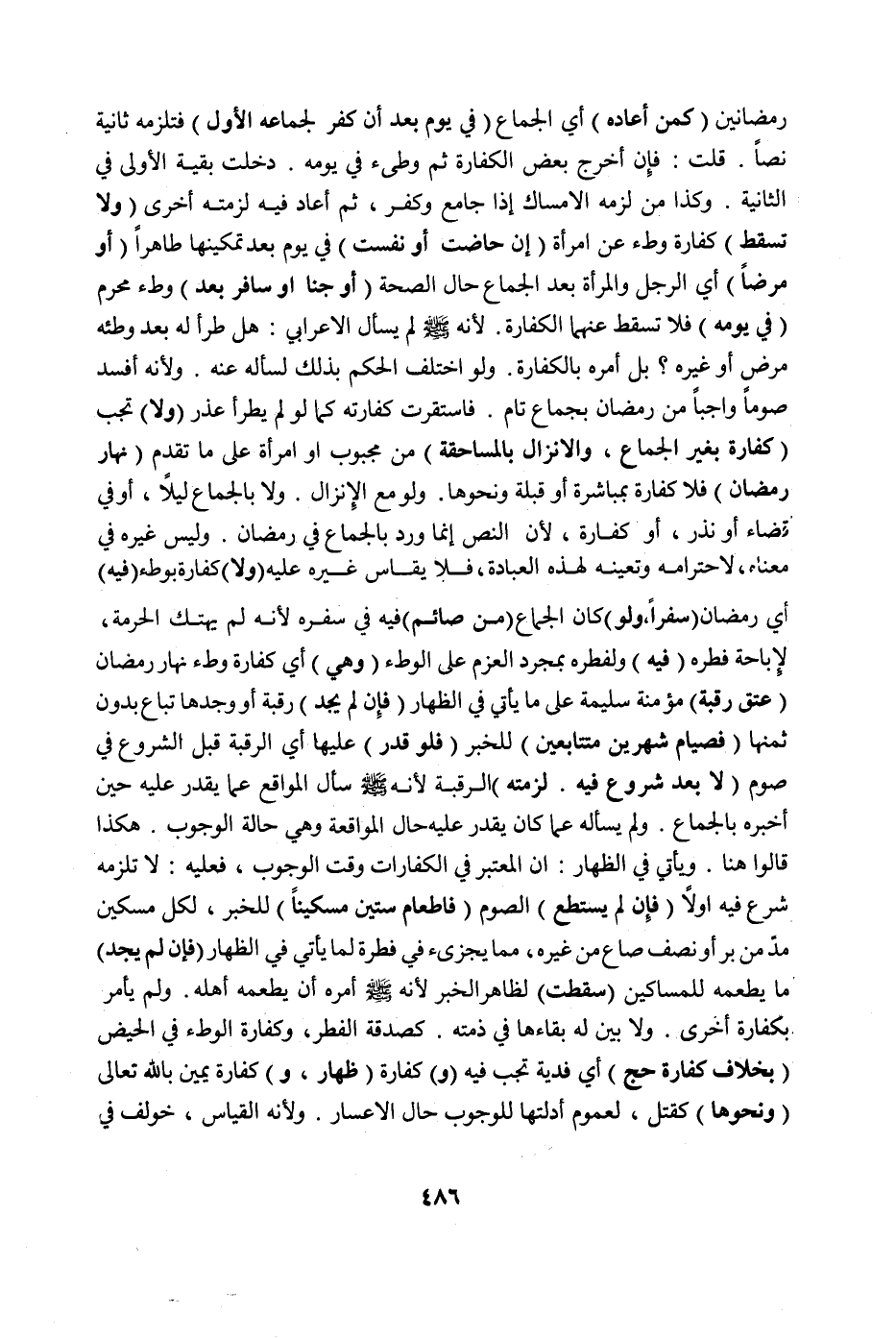 (وَلَا تَسْقُطُ) كَفَّارَةُ وَطْءٍ عَنْ امْرَأَةٍ (إنْ حَاضَتْ أَوْ نُفِسَتْ) فِي يَوْمٍ بَعْدَ تَمْكِينِهَا طَاهِرًا (أَوْ مَرِضَا) أَيْ: الرَّجُلُ وَالْمَرْأَةُ بَعْدَ الْجِمَاعِ حَالَ الصِّحَّةِ (أَوْ جُنَّا أَوْ سَافَرَ بَعْدَ) وَطْءٍ مُحَرَّمٍ (فِي يَوْمِهِ) فَلَا تَسْقُطُ عَنْهُمَا الْكَفَّارَةُ لِأَنَّهُ صَلَّى اللَّهُ عَلَيْهِ وَسَلَّمَ لَمْ يَسْأَلْ الْأَعْرَابِيَّ: هَلْ طَرَأَ لَهُ بَعْدَ وَطْئِهِ مَرَضٌ أَوْ غَيْرُهُ؟ بَلْ أَمَرَهُ بِالْكَفَّارَةِ وَلَوْ اخْتَلَفَ الْحُكْمُ بِذَلِكَ لَسَأَلَ عَنْهُ وَلِأَنَّهُ أَفْسَدَ صَوْمًا وَاجِبًا مِنْ رَمَضَانَ بِجِمَاعٍ تَامٍّ فَاسْتَقَرَّتْ كَفَّارَتُهُ كَمَا لَوْ لَمْ يَطْرَأْ عُذْرٌ