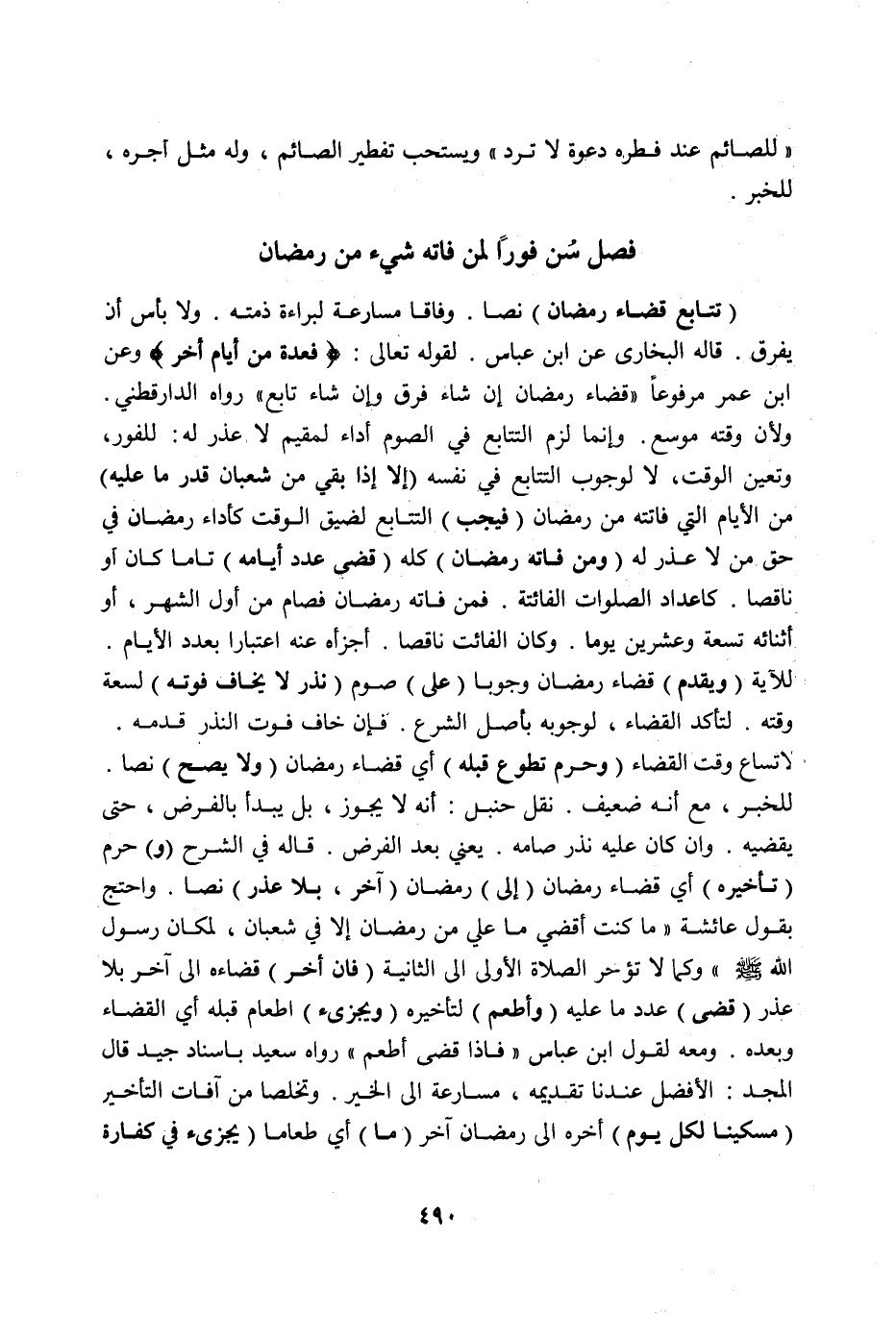 فَصْلٌ سُنَّ فَوْرًا لِمَنْ فَاتَهُ شَيْءٌ مِنْ رَمَضَانَ (تَتَابُعُ قَضَاءِ رَمَضَانَ) نَصًّا وِفَاقًا مُسَارَعَةً لِبَرَاءَةِ ذِمَّتِهِ وَلَا بَأْسَ أَنْ يُفَرِّقَ قَالَهُ الْبُخَارِيُّ عَنْ ابْنِ عَبَّاسٍ لِقَوْلِهِ تَعَالَى: {فَعِدَّةٌ مِنْ أَيَّامٍ أُخَرَ} [البقرة: ١٨٥] وَعَنْ ابْنِ عُمَرَ مَرْفُوعًا «قَضَاءُ رَمَضَانَ إنْ شَاءَ فَرَّقَ وإنْ شَاءَ تَابَعَ» رَوَاهُ الدَّارَقُطْنِيُّ وَلِأَنَّ وَقْتَهُ مُوَسَّعٌ وَإِنَّمَا لَزِمَ التَّتَابُعُ فِي الصَّوْمِ أَدَاءً لِمُقِيمٍ لَا عُذْرَ لَهُ: لِلْفَوْرِ، وَتَعَيُّنِ الْوَقْتِ، لَا لِوُجُوبِ التَّتَابُعِ فِي نَفْسِهِ (إلَّا إذَا بَقِيَ مِنْ شَعْبَانَ قَدْرَ مَا عَلَيْهِ) مِنْ الْأَيَّامِ الَّتِي فَاتَتْهُ مِنْ رَمَضَانَ (فَيَجِبُ) التَّتَابُعُ لِضِيقِ الْوَقْتِ كَأَدَاءِ رَمَضَانَ فِي حَقِّ مَنْ لَا عُذْرَ لَهُ (وَمَنْ فَاتَهُ رَمَضَانُ) كُلُّهُ (قَضَى عَدَدَ أَيَّامِهِ) تَامًّا كَانَ أَوْ نَاقِصًا كَأَعْدَادِ الصَّلَوَاتِ الْفَائِتَةِ، فَمَنْ فَاتَهُ رَمَضَانُ فَصَامَ مِنْ أَوَّلِ الشَّهْرِ، أَوْ أَثْنَائِهِ تِسْعَةً وَعِشْرِينَ يَوْمًا وَكَانَ الْفَائِتُ نَاقِصًا أَجْزَأَهُ عَنْهُ اعْتِبَارًا بِعَدَدِ الْأَيَّامِ لِلْآيَةِ (وَيُقَدَّمُ) قَضَاءُ رَمَضَانَ وُجُوبًا (عَلَى) صَوْمِ (نَذْرٍ لَا يَخَافُ فَوْتَهُ) لِسَعَةِ وَقْتِهِ لِتَأَكُّدِ الْقَضَاءِ، لِوُجُوبِهِ بِأَصْلِ الشَّرْعِ فَإِنْ خَافَ فَوْتَ النَّذْرِ قَدَّمَهُ لِاتِّسَاعِ وَقْتِ الْقَضَاءِ (وَحَرُمَ تَطَوُّعٌ قَبْلَهُ) أَيْ: قَضَاءِ رَمَضَانَ (وَلَا يَصِحُّ) نَصًّا لِلْخَبَرِ، مَعَ أَنَّهُ ضَعِيفٌ نَقَلَ حَنْبَلٌ: أَنَّهُ لَا يَجُوزُ، بَلْ يَبْدَأُ بِالْفَرْضِ، حَتَّى يَقْضِيَهُ وَإِنْ كَانَ عَلَيْهِ نَذْرٌ صَامَهُ يَعْنِي بَعْدَ الْفَرْضِ.