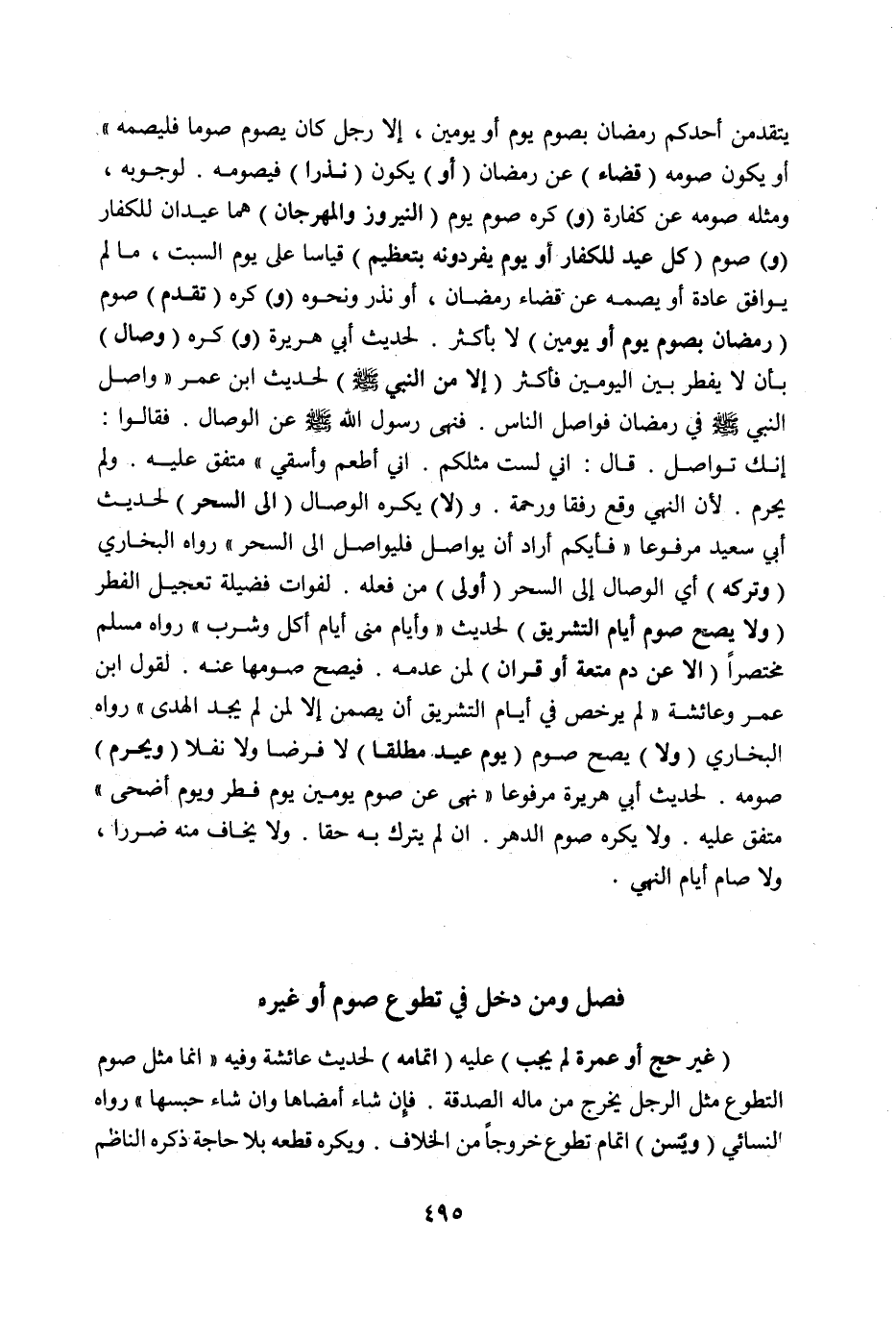 «لَا يَتَقَدَّمَنَّ أَحَدُكُمْ رَمَضَانَ بِصَوْمِ يَوْمٍ أَوْ يَوْمَيْنِ، إلَّا رَجُلٌ كَانَ يَصُومُ صَوْمًا فَلْيَصُمْهُ» أَوْ يَكُونُ صَوْمُهُ (قَضَاءً) عَنْ رَمَضَانَ (أَوْ) يَكُونُ (نَذْرًا) فَيَصُومُهُ لِوُجُوبِهِ، وَمِثْلُهُ صَوْمُهُ عَنْ كَفَّارَةٍ.