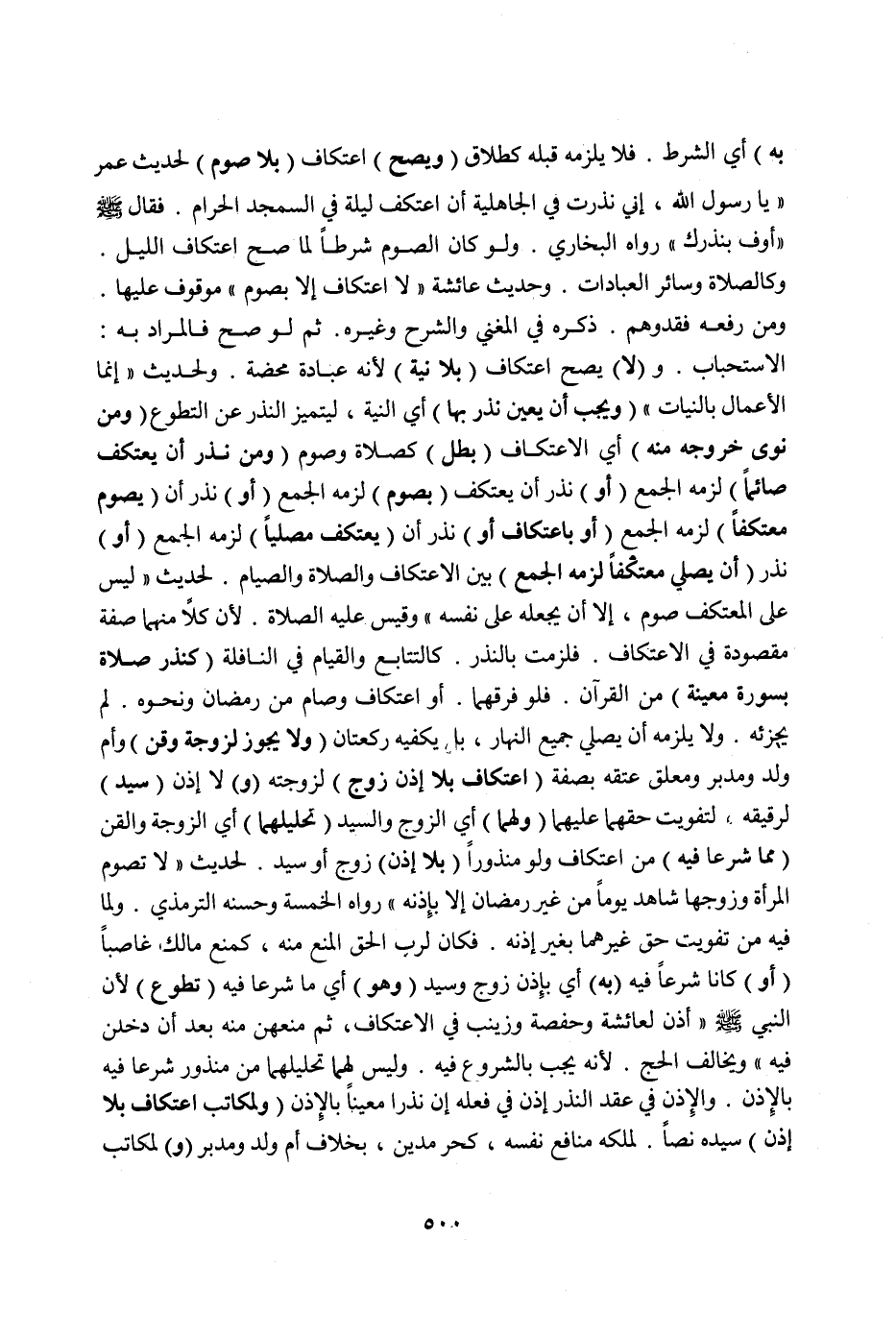 بِهِ) أَيْ: الشَّرْطِ فَلَا يَلْزَمُهُ قَبْلَهُ كَطَلَاقٍ (وَيَصِحُّ) اعْتِكَافٌ (بِلَا صَوْمٍ) لِحَدِيثِ عُمَرَ «يَا رَسُولَ اللَّهِ، إنِّي نَذَرْت فِي الْجَاهِلِيَّةِ أَنْ أَعْتَكِفَ لَيْلَةً فِي الْمَسْجِدِ الْحَرَامِ فَقَالَ صَلَّى اللَّهُ عَلَيْهِ وَسَلَّمَ أَوْفِ بِنَذْرِك» رَوَاهُ الْبُخَارِيُّ وَلَوْ كَانَ الصَّوْمُ شَرْطًا لِمَا صَحَّ اعْتِكَافُ اللَّيْلِ وَكَالصَّلَاةِ وَسَائِرِ الْعِبَادَاتِ وَحَدِيثِ عَائِشَةَ «لَا اعْتِكَافَ إلَّا بِصَوْمٍ» مَوْقُوفٌ عَلَيْهَا وَمَنْ رَفَعَهُ فَقَدْ وَهَمَ ذَكَرَهُ فِي الْمُغْنِي وَالشَّرْحِ وَغَيْرِهِ ثُمَّ لَوْ صَحَّ فَالْمُرَادُ بِهِ: الِاسْتِحْبَابُ وَ (لَا) يَصِحُّ اعْتِكَافٌ (بِلَا نِيَّةٍ) لِأَنَّهُ عِبَادَةٌ مَحْضَةٌ وَلِحَدِيثِ «إنَّمَا الْأَعْمَالُ بِالنِّيَّاتِ» (وَيَجِبُ أَنْ يُعَيَّنَ نَذْرٌ بِهَا) أَيْ النِّيَّةِ، لِيَتَمَيَّزَ النَّذْرُ عَنْ التَّطَوُّعِ (وَمَنْ نَوَى خُرُوجَهُ مِنْهُ) أَيْ: الِاعْتِكَافِ (بَطَلَ) كَصَلَاةٍ وَصَوْمٍ.