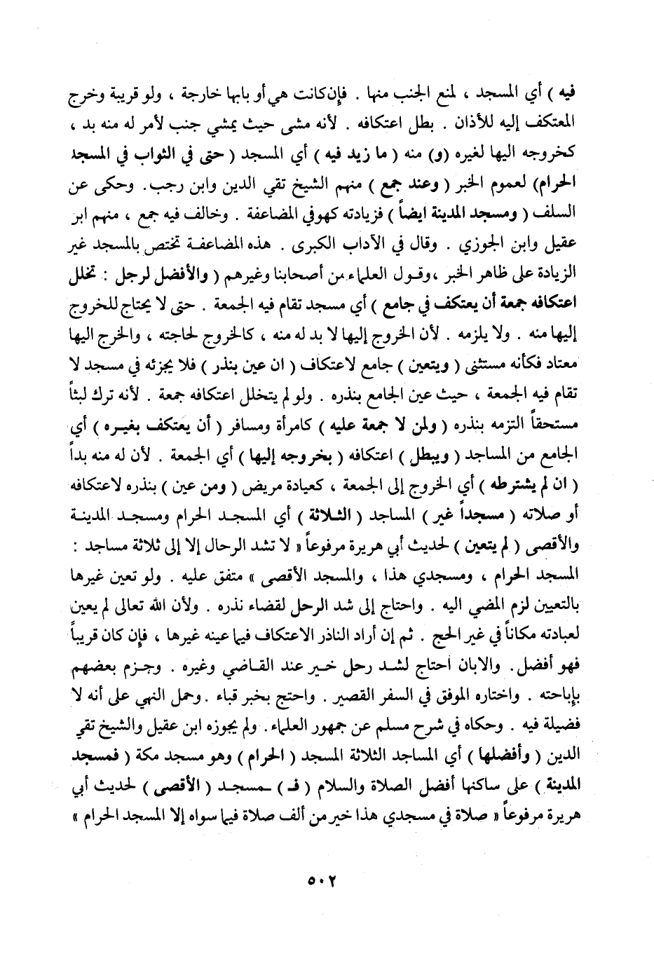 (وَمَنْ عَيَّنَ) بِنَذْرِهِ لِاعْتِكَافِهِ أَوْ صَلَاتِهِ (مَسْجِدًا غَيْرَ) الْمَسَاجِدِ (الثَّلَاثَةِ) أَيْ الْمَسْجِدِ الْحَرَامِ وَمَسْجِدِ الْمَدِينَةِ وَالْأَقْصَى (لَمْ يَتَعَيَّنْ) لِحَدِيثِ أَبِي هُرَيْرَةَ مَرْفُوعًا «لَا تُشَدُّ الرِّحَالُ إلَّا إلَى ثَلَاثَةِ مَسَاجِدَ: الْمَسْجِدِ الْحَرَامِ، وَمَسْجِدِي هَذَا، وَالْمَسْجِدِ الْأَقْصَى» مُتَّفَقٌ عَلَيْهِ وَلَوْ تَعَيَّنَ غَيْرُهَا بِالتَّعْيِينِ لَزِمَ الْمُضِيُّ إلَيْهِ وَاحْتَاجَ إلَى شَدِّ الرَّحْلِ لِقَضَاءِ نَذْرِهِ وَلِأَنَّ اللَّهَ تَعَالَى لَمْ يُعَيِّنْ لِعِبَادَتِهِ مَكَانًا فِي غَيْرِ الْحَجِّ ثُمَّ إنْ أَرَادَ النَّاذِرُ الِاعْتِكَافَ فِيمَا عَيَّنَهُ غَيْرَهَا، فَإِنْ كَانَ قَرِيبًا فَهُوَ أَفْضَلُ وَإِلَّا بِأَنْ احْتَاجَ لِشَدِّ رَحْلٍ خُيِّرَ عِنْدَ الْقَاضِي وَغَيْرِهِ وَجَزَمَ بَعْضُهُمْ بِإِبَاحَتِهِ وَاخْتَارَهُ الْمُوَفَّقُ فِي السَّفَرِ الْقَصِيرِ وَاحْتَجَّ بِخَبَرِ قُبَاءَ وَحُمِلَ النَّهْيُ عَلَى أَنَّهُ لَا فَضِيلَةَ فِيهِ وَحَكَاهُ فِي شَرْحِ مُسْلِمٍ عَنْ جُمْهُورِ الْعُلَمَاءِ وَلَمْ يُجَوِّزْهُ ابْنُ عَقِيلٍ وَالشَّيْخُ تَقِيُّ الدِّينِ