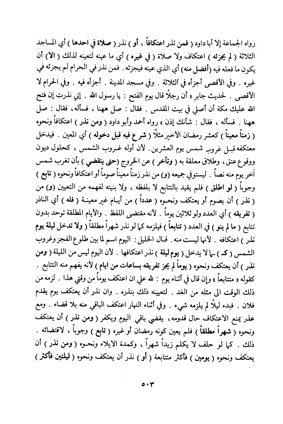 وَإِنْ نَذَرَ أَنْ يَعْتَكِفَ يَوْمَ يَقْدَمُ فُلَانٌ فَبَدَأَ لَيْلًا لَمْ يَلْزَمْهُ شَيْءٌ وَفِي أَثْنَاءِ النَّهَارِ اعْتَكَفَ الْبَاقِيَ مِنْهُ بِلَا قَضَاءٍ وَمَعَ عُذْرٍ يَمْنَعُ الِاعْتِكَافَ حَالَ قُدُومِهِ، يَقْضِي بَاقِيَ الْيَوْمِ وَيُكَفِّرُ (وَمَنْ نَذَرَ) أَنْ يَعْتَكِفَ وَنَحْوَهُ (شَهْرًا مُطْلَقًا) فَلَمْ يُعَيِّنْ كَوْنَهُ رَمَضَانَ أَوْ غَيْرَهُ (تَابَعَ) وُجُوبًا، لِاقْتِضَائِهِ ذَلِكَ كَمَا لَوْ حَلَفَ لَا يُكَلِّمُ زَيْدًا شَهْرًا، وَكَمُدَّةِ الْإِيلَاءِ وَنَحْوِهِ (وَمَنْ نَذَرَ) أَنْ يَعْتَكِفَ وَنَحْوَهُ (يَوْمَيْنِ) فَأَكْثَرَ مُتَتَابِعَةً (أَوْ) نَذَرَ أَنْ يَعْتَكِفَ وَنَحْوَهُ (لَيْلَتَيْنِ فَأَكْثَرَ)