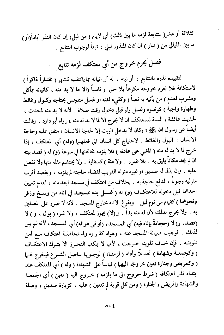 فَصْلٌ يَحْرُمُ خُرُوجُ مِنْ أَيْ مُعْتَكَفٍ لَزِمَهُ تَتَابُعٌ لِتَقْيِيدِهِ نَذْرَهُ بِالتَّتَابُعِ، أَوْ نِيَّتِهِ، لَهُ أَوْ إتْيَانِهِ بِمَا يَقْتَضِيهِ كَشَهْرٍ (مُخْتَارًا ذَاكِرًا) لِاسْتِكَافَةٍ فَلَا يَحْرُمُ خُرُوجُهُ مُكْرَهًا بِلَا حَقٍّ أَوْ نَاسِيًا (إلَّا مَا لَا بُدَّ مِنْهُ، كَإِتْيَانِهِ بِمَأْكَلٍ وَمَشْرَبٍ لِعَدَمِ) مَنْ يَأْتِيهِ بِهِ نَصًّا (وَكَقَيْءِ بَغْتَةٍ أَوْ غُسْلِ مُتَنَجِّسٍ يَحْتَاجُهُ وَكَبَوْلٍ وَغَائِطٍ وَطَهَارَةٍ وَاجِبَةٍ) كَوُضُوءٍ وَغُسْلٍ وَلَوْ قَبْلَ دُخُولِ وَقْتِ صَلَاةٍ لِأَنَّهُ لَا بُدَّ مِنْهُ لِمُحْدِثٍ، لِحَدِيثِ عَائِشَةَ «السُّنَّةُ لِلْمُعْتَكِفِ أَنْ لَا يَخْرُجَ إلَّا لِمَا لَا بُدَّ لَهُ مِنْهُ» رَوَاهُ أَبُو دَاوُد وَقَالَتْ أَيْضًا عَنْ رَسُولِ اللَّهِ صَلَّى اللَّهُ عَلَيْهِ وَسَلَّمَ «وَكَانَ لَا يَدْخُلُ الْبَيْتَ إلَّا لِحَاجَةِ الْإِنْسَانِ» مُتَّفَقٌ عَلَيْهِ وَحَاجَةُ الْإِنْسَانِ: الْبَوْلُ وَالْغَائِطُ لِاحْتِيَاجِ كُلِّ إنْسَانٍ إلَى فِعْلِهِمَا