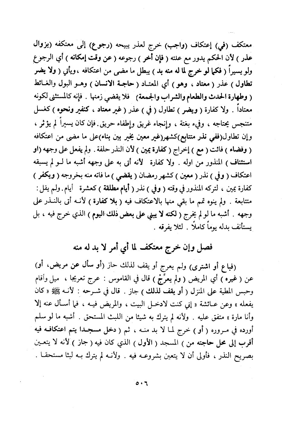 مُعْتَكِفٍ (فِي) اعْتِكَافٍ (وَاجِبٍ) خَرَجَ لِعُذْرٍ يُبِيحُهُ (رُجُوعٌ) إلَى مُعْتَكَفِهِ (بِزَوَالِ عُذْرٍ) لِأَنَّ الْحُكْمَ يَدُورُ مَعَ عِلَّتِهِ (فَإِنْ أَخَّرَ) رُجُوعَهُ (عَنْ وَقْتِ إمْكَانِهِ) أَيْ الرُّجُوعِ وَلَوْ يَسِيرًا (فَكَمَا لَوْ خَرَجَ لِمَا لَهُ مِنْهُ بُدٌّ) يَبْطُلُ مَا مَضَى مِنْ اعْتِكَافِهِ، وَيَأْتِي (وَلَا يَضُرُّ تَطَاوُلُ) عُذْرٍ (مُعْتَادٍ، وَهُوَ) أَيْ الْمُعْتَادُ (حَاجَةُ الْإِنْسَانِ) وَهُوَ الْبَوْلُ وَالْغَائِطُ (وَطَهَارَةُ الْحَدَثِ وَالطَّعَامِ وَالشَّرَابِ وَالْجُمُعَةِ) فَلَا يَقْضِيَ زَمَنَهَا فَإِنَّهُ كَالْمُسْتَثْنَى لِكَوْنِهِ مُعْتَادًا وَلَا كَفَّارَةَ (وَيَضُرُّ) تَطَاوُلٌ (فِي) عُذْرٍ (غَيْرِ مُعْتَادٍ، كَنَفِيرٍ وَنَحْوِهِ) كَغَسْلِ مُتَنَجِّسٍ يَحْتَاجُهُ، وَقَيْءٍ بَغْتَةً، وَإِنْجَاءِ غَرِيقٍ وَإِطْفَاءِ حَرِيقٍ فَإِنْ كَانَ يَسِيرًا لَمْ يُؤَثِّرْ، وَإِنْ تَطَاوَلَ