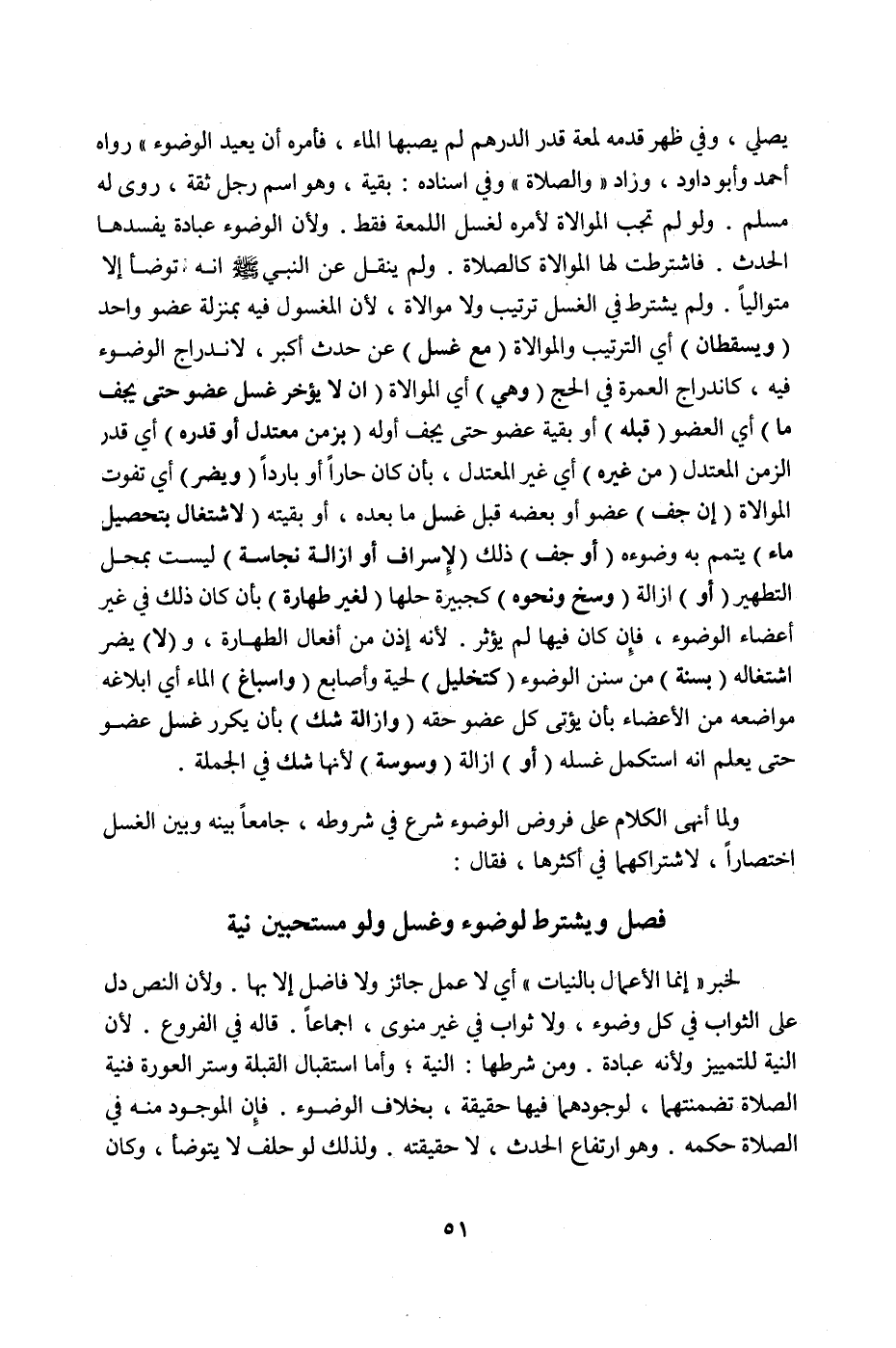 فَقَالَ: فَصْلٌ وَيُشْتَرَطُ لِوُضُوءٍ وَغُسْلٍ وَلَوْ مُسْتَحَبَّيْنِ نِيَّةٌ لِخَبَرِ «إنَّمَا الْأَعْمَالُ بِالنِّيَّاتِ» أَيْ لَا عَمَلَ جَائِزٌ وَلَا فَاضِلٌ إلَّا بِهَا. وَلِأَنَّ النَّصَّ دَلَّ عَلَى الثَّوَابِ فِي كُلِّ وُضُوءٍ، وَلَا ثَوَابَ فِي غَيْرِ مَنْوِيٍّ إجْمَاعًا. قَالَهُ فِي الْفُرُوعِ ; لِأَنَّ النِّيَّةَ لِلتَّمْيِيزِ وَلِأَنَّهُ عِبَادَةٌ.