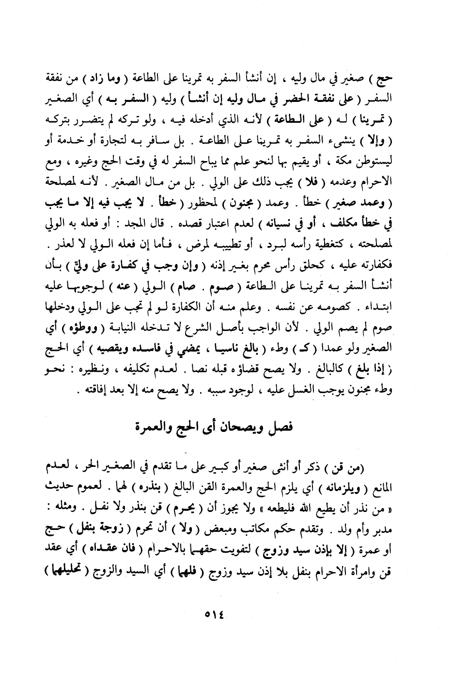 حَجٍّ) صَغِيرٍ فِي مَالِ وَلِيِّهِ، إنْ أَنْشَأَ السَّفَرَ بِهِ تَمْرِينًا عَلَى الطَّاعَةِ (وَمَا زَادَ) مِنْ نَفَقَةِ السَّفَرِ (عَلَى نَفَقَةِ الْحَضَرِ فِي مَالِ وَلِيِّهِ إنْ أَنْشَأَ) وَلِيُّهُ (السَّفَرَ بِهِ) أَيْ الصَّغِيرِ (تَمْرِينًا) لَهُ (عَلَى الطَّاعَةِ) لِأَنَّهُ الَّذِي أَدْخَلَهُ فِيهِ، وَلَوْ تَرَكَهُ لَمْ يَتَضَرَّرْ بِتَرْكِهِ (وَإِلَّا) يُنْشِئْ السَّفَرَ بِهِ تَمْرِينًا عَلَى الطَّاعَةِ بَلْ سَافَرَ بِهِ لِتِجَارَةٍ أَوْ خِدْمَةٍ أَوْ لِيَسْتَوْطِنَ مَكَّةَ، أَوْ يُقِيمَ بِهَا لِنَحْوِ عِلْمٍ مِمَّا يُبَاحُ السَّفَرُ لَهُ فِي وَقْتِ الْحَجِّ وَغَيْرِهِ، وَمَعَ الْإِحْرَامِ وَعَدَمِهِ (فَلَا) يَجِبُ ذَلِكَ عَلَى الْوَلِيِّ بَلْ مِنْ مَالِ الصَّغِيرِ لِأَنَّهُ لِمَصْلَحَةٍ