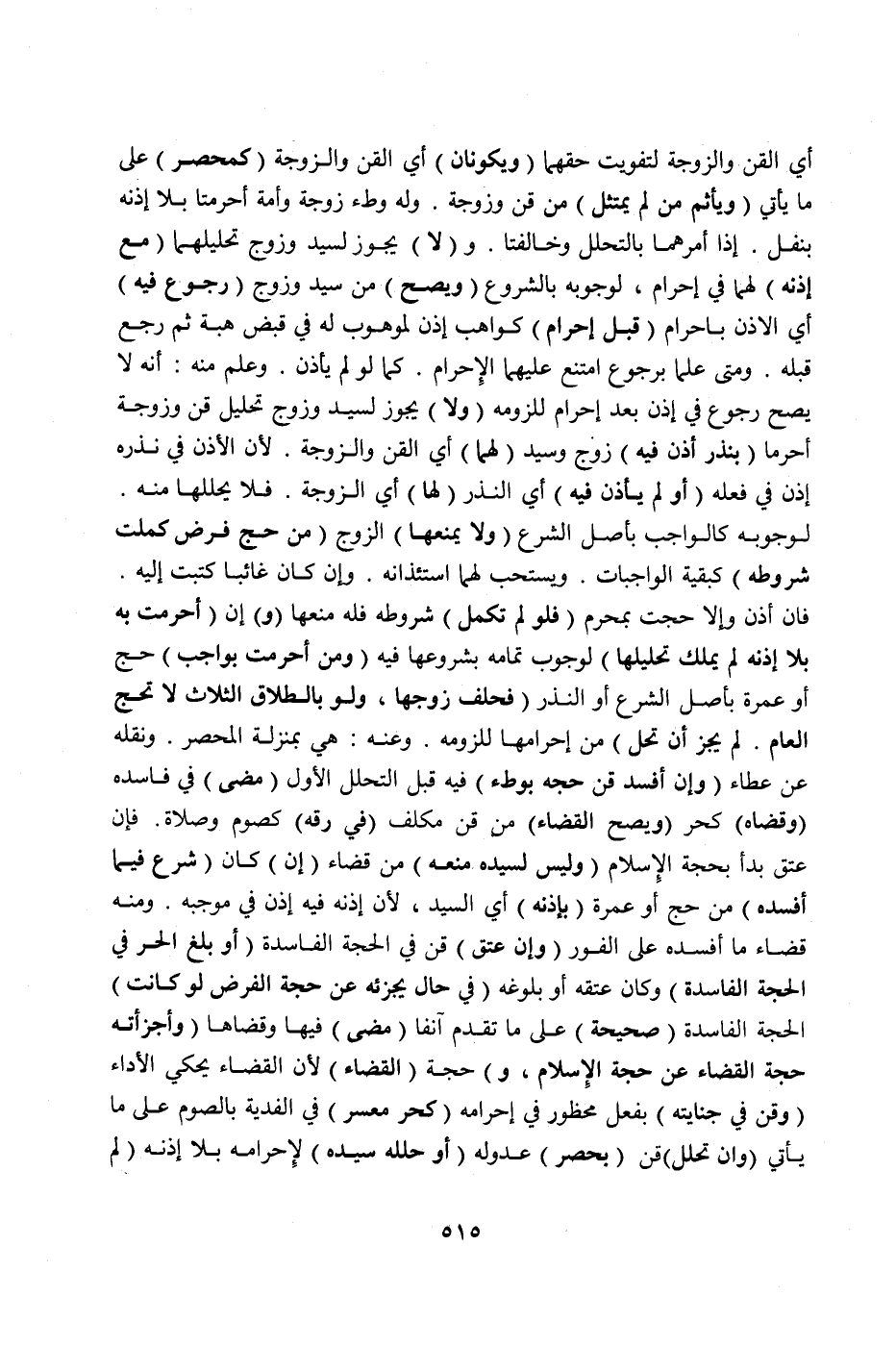 (وَ) إنْ (أَحْرَمَتْ بِهِ بِلَا إذْنِهِ لَمْ يَمْلِكْ تَحْلِيلَهَا) لِوُجُوبِ تَمَامِهِ بِشُرُوعِهَا فِيهِ (وَمَنْ أَحْرَمَتْ بِوَاجِبٍ) حَجٍّ أَوْ عُمْرَةٍ بِأَصْلِ الشَّرْعِ أَوْ النَّذْرِ (فَحَلَفَ زَوْجُهَا، وَلَوْ بِالطَّلَاقِ الثَّلَاثِ لَا تَحُجَّ الْعَامَ لَمْ يَجُزْ أَنْ تَحِلَّ) مِنْ إحْرَامِهَا لِلُزُومِهِ وَعَنْهُ: هِيَ بِمَنْزِلَةِ الْمُحْصَرِ وَنَقَلَهُ عَنْ عَطَاءٍ (وَإِنْ أَفْسَدَ قِنٌّ حَجَّهُ بِوَطْءٍ) فِيهِ قَبْلَ التَّحَلُّلِ الْأَوَّلِ (مَضَى) فِي فَاسِدِهِ (وَقَضَاهُ) كَحُرٍّ (وَيَصِحُّ الْقَضَاءُ) مِنْ قِنٍّ مُكَلَّفٍ (فِي رِقِّهِ) كَصَوْمٍ وَصَلَاةٍ فَإِنْ عَتَقَ بَدَأَ بِحِجَّةِ الْإِسْلَامِ (وَلَيْسَ لِسَيِّدِهِ مَنْعُهُ) مِنْ قَضَاءٍ (إنْ) كَانَ (شَرَعَ فِيمَا أَفْسَدَهُ) مِنْ حَجٍّ أَوْ عُمْرَةٍ (بِإِذْنِهِ) أَيْ السَّيِّدِ، لِأَنَّ إذْنَهُ فِيهِ إذْنٌ فِي مُوجَبِهِ وَمِنْهُ قَضَاءُ مَا أَفْسَدَهُ عَلَى الْفَوْرِ