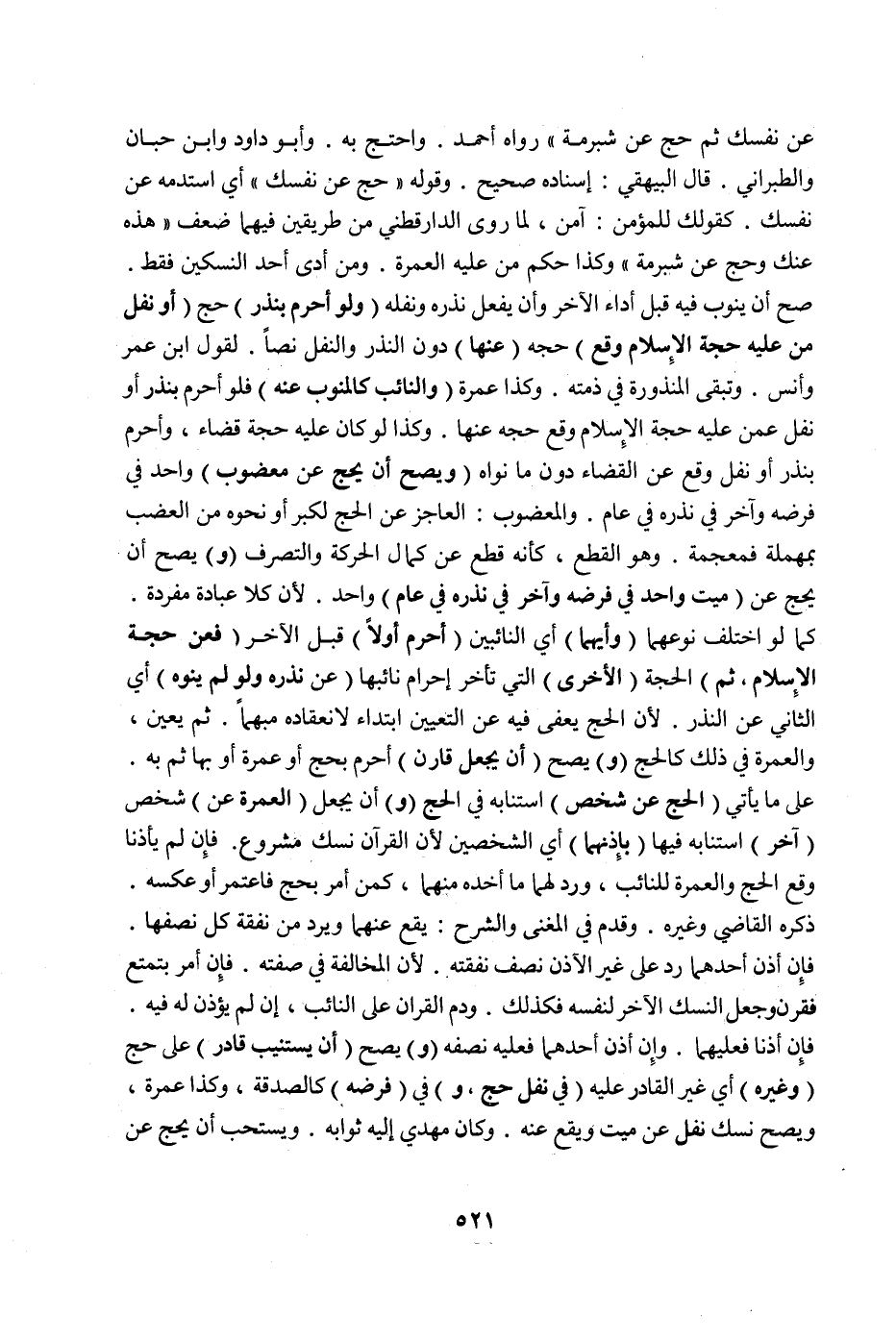 رَوَاهُ أَحْمَدُ وَاحْتَجَّ بِهِ وَأَبُو دَاوُد وَابْنُ حِبَّانَ وَالطَّبَرَانِيُّ قَالَ الْبَيْهَقِيُّ: إسْنَادُهُ صَحِيحٌ وَقَوْلُهُ «حُجَّ عَنْ نَفْسِك» أَيْ اسْتَدِمْهُ عَنْ نَفْسِك كَقَوْلِك لِلْمُؤْمِنِ: آمِنْ، لِمَا رَوَى الدَّارَقُطْنِيُّ مِنْ طَرِيقَيْنِ فِيهِمَا ضَعْفٌ «هَذِهِ عَنْك وَحُجَّ عَنْ شُبْرُمَةَ»