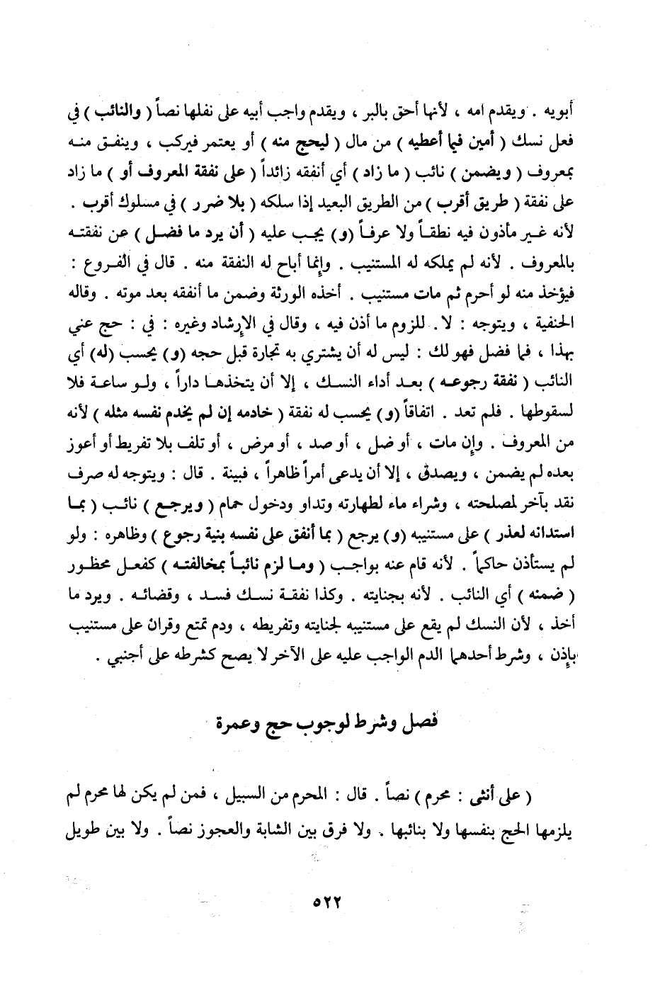 أَبَوَيْهِ وَيُقَدِّمُ أُمَّهُ، لِأَنَّهَا أَحَقُّ بِالْبِرِّ، وَيُقَدِّمُ وَاجِبَ أَبِيهِ عَلَى نَفْلِهَا نَصًّا (وَالنَّائِبُ) فِي فِعْلِ نُسُكٍ (أَمِينٌ فِيمَا أُعْطِيهِ) مِنْ مَالٍ (لِيَحُجَّ مِنْهُ) أَوْ يَعْتَمِرَ فَيَرْكَبُ، وَيُنْفِقُ مِنْهُ بِمَعْرُوفٍ (وَيَضْمَنُ) نَائِبٌ (مَا زَادَ) أَيْ أَنْفَقَهُ زَائِدًا (عَلَى نَفَقَةِ الْمَعْرُوفِ أَوْ) مَا زَادَ عَلَى نَفَقَةِ (طَرِيقٍ أَقْرَبَ) مِنْ الطَّرِيقِ الْبَعِيدِ إذَا سَلَكَهُ (بِلَا ضَرَرٍ) فِي مَسْلُوكٍ أَقْرَبَ لِأَنَّهُ غَيْرُ مَأْذُونٍ فِيهِ نُطْقًا وَلَا عُرْفًا.