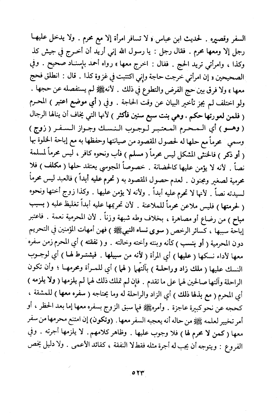 السَّفَرِ وَقَصِيرِهِ لِحَدِيثِ ابْنِ عَبَّاسٍ «لَا تُسَافِرْ امْرَأَةٌ إلَّا مَعَ مَحْرَمٍ وَلَا يَدْخُلُ عَلَيْهَا رَجُلٌ إلَّا وَمَعَهَا مَحْرَمٌ فَقَالَ رَجُلٌ: يَا رَسُولَ اللَّهِ إنِّي أُرِيدُ أَنْ أَخْرُجَ فِي جَيْشِ كَذَا وَكَذَا، وَامْرَأَتِي تُرِيدُ الْحَجَّ فَقَالَ: اُخْرُجْ مَعَهَا» رَوَاهُ أَحْمَدُ بِإِسْنَادٍ صَحِيحٍ.