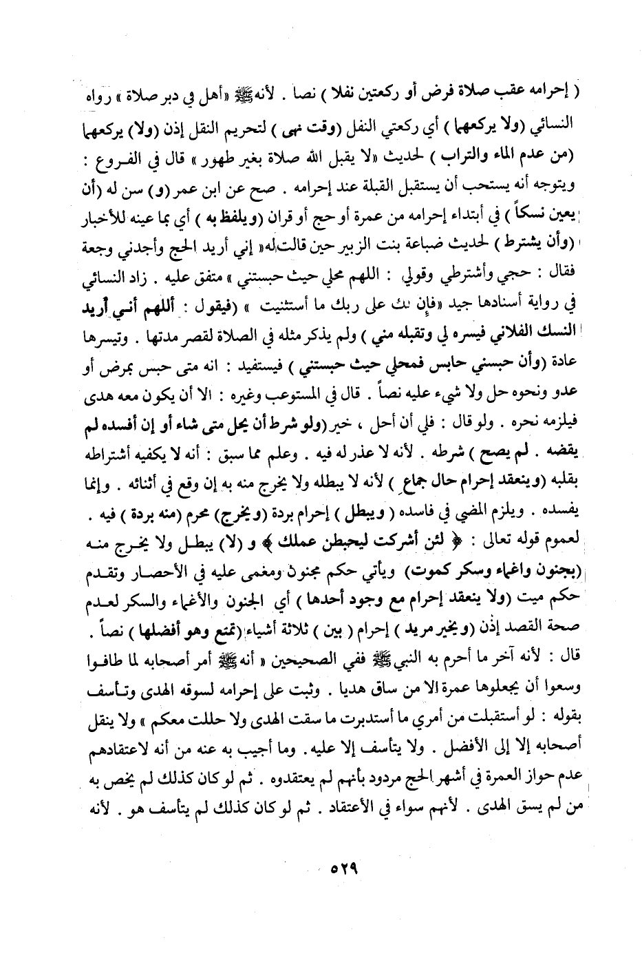 (وَ) سُنَّ لَهُ (أَنْ يُعَيِّنَ نُسُكًا) فِي ابْتِدَاءِ إحْرَامِهِ مِنْ عُمْرَةٍ أَوْ حَجٍّ أَوْ قِرَانٍ (وَيَلْفِظُ بِهِ) أَيْ بِمَا عَيَّنَهُ لِلْأَخْبَارِ (وَأَنْ يَشْتَرِطَ) لِحَدِيثِ ضُبَاعَةَ بِنْتِ الزُّبَيْرِ حِينَ قَالَتْ لَهُ «إنِّي أُرِيدُ الْحَجَّ وَأَجِدُنِي وَجِعَةً فَقَالَ: حُجِّي وَاشْتَرِطِي وَقَوْلِي: اللَّهُمَّ مَحَلِّي حَيْثُ حَبَسْتَنِي» مُتَّفَقٌ عَلَيْهِ زَادَ النَّسَائِيُّ فِي رِوَايَةٍ إسْنَادُهَا جَيِّدٌ «فَإِنَّ لَك عَلَى رَبِّك مَا اسْتَثْنَيْتَ» (فَيَقُولَ: اللَّهُمَّ إنِّي أُرِيدُ النُّسُكَ الْفُلَانِيَّ فَيَسِّرْهُ لِي وَتَقَبَّلْهُ مِنِّي) وَلَمْ يَذْكُرْ مِثْلَهُ فِي الصَّلَاةِ لِقِصَرِ مُدَّتِهَا وَتَيَسُّرِهَا عَادَةً (وَإِنْ حَبَسَنِي حَابِسٌ فَمَحَلِّي حَيْثُ حَبَسْتَنِي) فَيَسْتَفِيدُ: أَنَّهُ مَتَى حُبِسَ بِمَرَضٍ أَوْ عَدُوٍّ وَنَحْوِهِ حَلَّ وَلَا شَيْءَ عَلَيْهِ نَصًّا قَالَ فِي الْمُسْتَوْعِبِ وَغَيْرِهِ: إلَّا أَنْ يَكُونَ مَعَهُ هَدْيٌ فَيَلْزَمَهُ نَحْوه وَلَوْ قَالَ: فَلِي أَنْ أَحِلَّ، خُيِّرَ