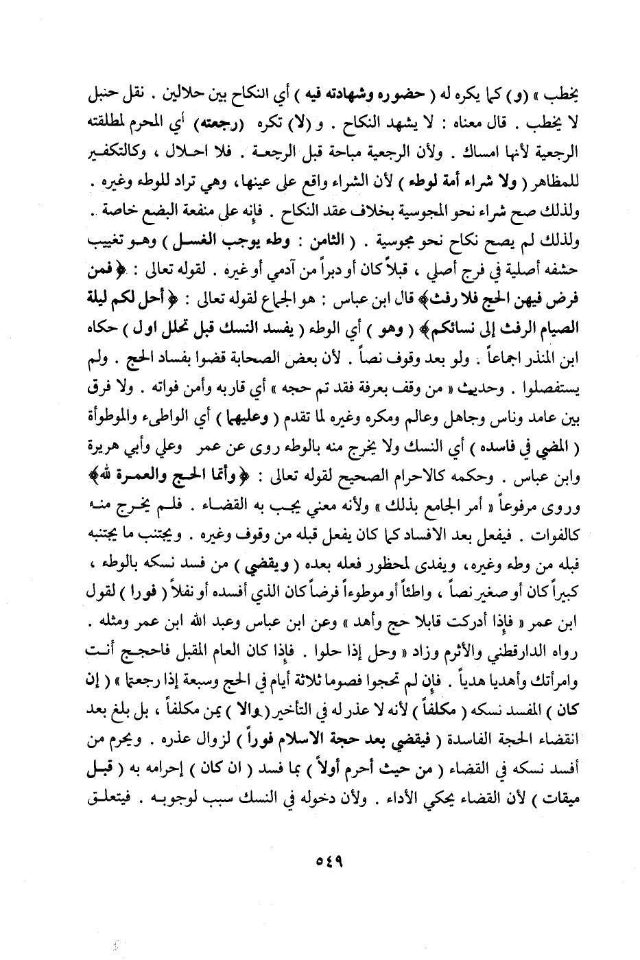 وَحَدِيثُ «مَنْ وَقَفَ بِعَرَفَةَ فَقَدْ تَمَّ حَجُّهُ» أَيْ قَارَبَهُ وَأَمِنَ فَوَاتَهُ وَلَا فَرْقَ بَيْنَ عَامِدٍ وَنَاسٍ وَجَاهِلٍ وَعَالِمٍ وَمُكْرَهٍ وَغَيْرِهِ لِمَا تَقَدَّمَ (وَعَلَيْهِمَا) أَيْ الْوَاطِئِ وَالْمَوْطُوءَةِ (الْمُضِيُّ فِي فَاسِدِهِ) أَيْ النُّسُكِ وَلَا يُخْرَجُ مِنْهُ بِالْوَطْءِ رُوِيَ عَنْ عُمَرَ وَعَلِيٍّ وَأَبِي هُرَيْرَةَ وَابْنِ عَبَّاسٍ وَحُكْمُهُ كَالْإِحْرَامِ الصَّحِيح لِقَوْلِهِ تَعَالَى: {وَأَتِمُّوا الْحَجَّ وَالْعُمْرَةَ لِلَّهِ} [البقرة: ١٩٦] وَرُوِيَ مَرْفُوعًا " أُمِرَ الْمُجَامِعُ بِذَلِكَ " وَلِأَنَّهُ مَعْنًى يَجِبُ بِهِ الْقَضَاءُ فَلَمْ يَخْرُجْ مِنْهُ كَالْفَوَاتِ فَيُفْعَلُ بَعْدَ الْإِفْسَادِ كَمَا كَانَ يُفْعَلُ قَبْلَهُ مِنْ وُقُوفٍ وَغَيْرِهِ وَيَجْتَنِبُ مَا يَجْتَنِبُهُ قَبْلَهُ مِنْ وَطْءٍ وَغَيْرِهِ، وَيُفْدَى لِمَحْظُورٍ فَعَلَهُ بَعْدَهُ