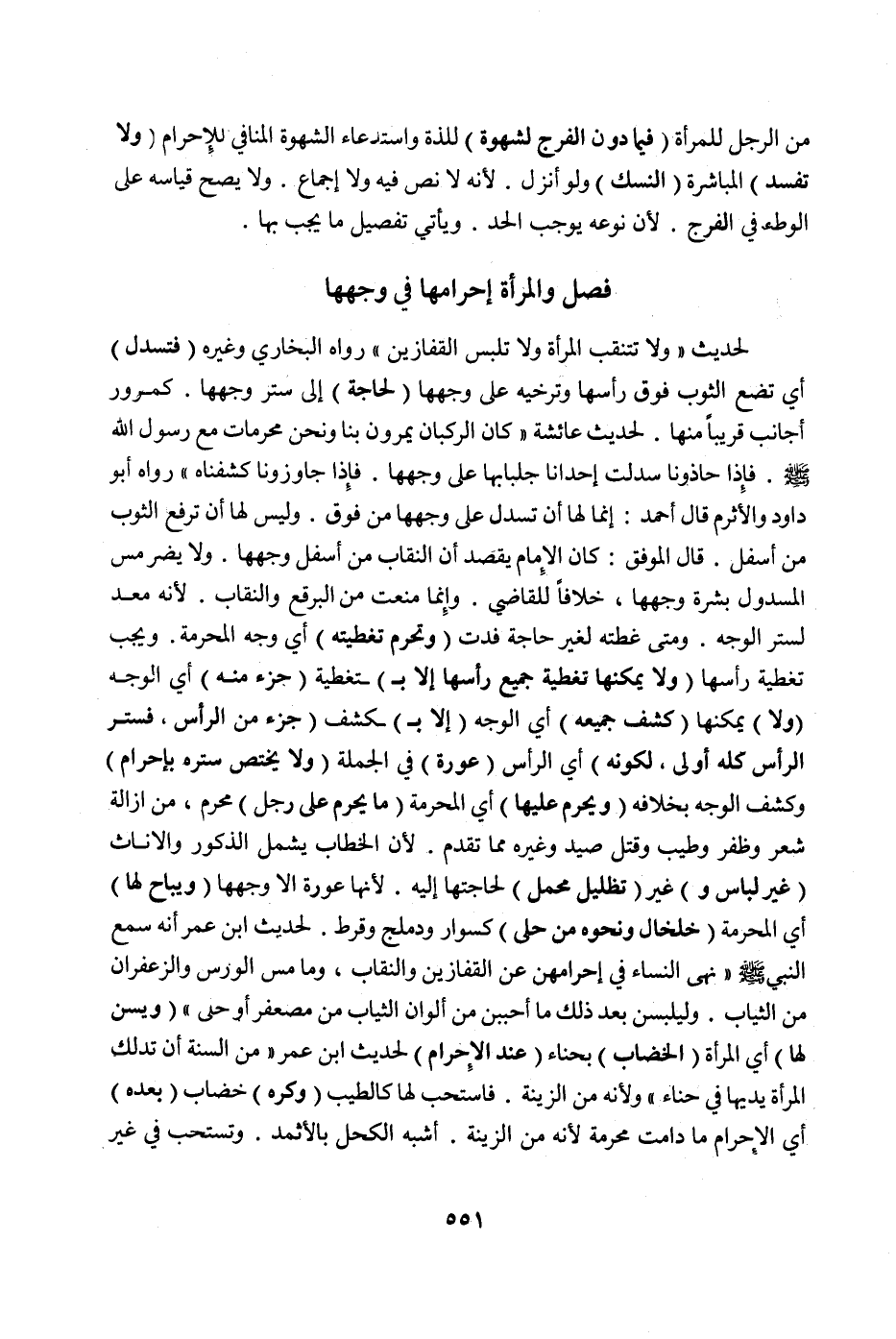 لِحَدِيثِ «وَلَا تَتَنَقَّبُ الْمَرْأَةُ وَلَا تَلْبَسُ الْقُفَّازَيْنِ» رَوَاهُ الْبُخَارِيُّ وَغَيْرُهُ (فَتُسْدِلُ) أَيْ تَضَعُ الثَّوْبَ فَوْقَ رَأْسِهَا وَتُرْخِيهِ عَلَى وَجْهِهَا (لِحَاجَةٍ) إلَى سَتْرِ وَجْهِهَا كَمُرُورِ أَجَانِبَ قَرِيبًا مِنْهَا لِحَدِيثِ عَائِشَةَ «كَانَ الرُّكْبَانُ يَمُرُّونَ بِنَا وَنَحْنُ مُحْرِمَاتٌ مَعَ رَسُولِ اللَّهِ صَلَّى اللَّهُ عَلَيْهِ وَسَلَّمَ فَإِذَا حَاذَوْنَا سَدَلَتْ إحْدَانَا جِلْبَابَهَا عَلَى وَجْهِهَا فَإِذَا جَاوَزُونَا كَشَفْنَاهُ» رَوَاهُ أَبُو دَاوُد وَالْأَثْرَمُ قَالَ أَحْمَدُ: إنَّمَا لَهَا أَنْ تُسْدِلَ عَلَى وَجْهِهَا مِنْ فَوْقُ وَلَيْسَ لَهَا أَنْ تَرْفَعَ الثَّوْبَ مِنْ أَسْفَلَ.