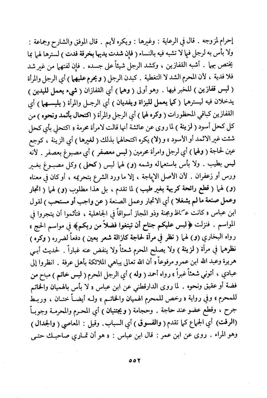 وَفِي رِوَايَةٍ " رُخِّصَ لِلْمُحْرِمِ الْهِمْيَانُ وَالْخَاتَمُ " وَلَهُ أَيْضًا خِتَانٌ، وَرَبْطُ جُرْحٍ، وَقَطْعُ عُضْوٍ عِنْدَ حَاجَةٍ وَحِجَامَةٌ (وَيَجْتَنِبَانِ) أَيْ الْمُحْرِمُ وَالْمُحْرِمَةُ وُجُوبًا (الرَّفَثَ) أَيْ الْجِمَاعَ كَمَا تَقَدَّمَ (وَالْفُسُوقَ) أَيْ السِّبَابَ وَقِيلَ: الْمَعَاصِي (وَالْجِدَالَ) وَهُوَ الْمِرَاءُ رُوِيَ عَنْ ابْنِ عُمَرَ: قَالَ ابْنُ عَبَّاسٍ: " هُوَ أَنْ تُمَارِيَ صَاحِبَكَ حَتَّى