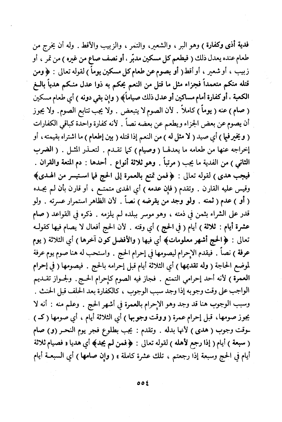 فِدْيَةِ أَذًى وَكَفَّارَةٍ) وَهُوَ الْبُرُّ، وَالشَّعِيرُ، وَالتَّمْرُ، وَالزَّبِيبُ وَالْأَقِطُ وَلَهُ أَنْ يُخْرِجَ مِنْ طَعَامٍ عِنْدَهُ يَعْدِلُ ذَلِكَ (فَيُطْعِمَ كُلَّ مِسْكِينٍ مُدَّ بُرٍّ، أَوْ نِصْفَ صَاعٍ مِنْ غَيْرِهِ) مِنْ تَمْرٍ، أَوْ زَبِيبٍ، أَوْ شَعِيرٍ، أَوْ أَقِطٍ (أَوْ يَصُومَ عَنْ طَعَامِ كُلِّ مِسْكِينٍ يَوْمًا) لِقَوْلِهِ تَعَالَى: {وَمَنْ قَتَلَهُ مِنْكُمْ مُتَعَمِّدًا فَجَزَاءٌ مِثْلُ مَا قَتَلَ مِنْ النَّعَمِ يَحْكُمُ بِهِ ذَوَا عَدْلٍ مِنْكُمْ هَدْيًا بَالِغَ الْكَعْبَةِ أَوْ كَفَّارَةٌ طَعَامُ مَسَاكِينَ أَوْ عَدْلُ ذَلِكَ صِيَامًا} [المائدة: ٩٥] (وَإِنْ بَقِيَ دُونَهُ) أَيْ طَعَامِ مِسْكِينٍ (صَامَ) عَنْهُ (يَوْمًا) كَامِلًا لِأَنَّ الصَّوْمَ لَا يَتَبَعَّضُ وَلَا يَجِبُ تَتَابُعُ الصَّوْمِ