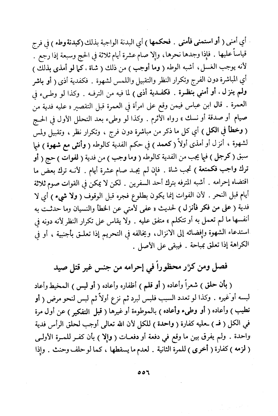 ِ مِنْ جِنْسٍ غَيْرِ قَتْلِ صَيْدٍ (بِأَنْ حَلَقَ) شَعْرًا وَأَعَادَهُ (أَوْ قَلَّمَ) أَظْفَارَهُ وَأَعَادَهُ (أَوْ لَبِسَ) الْمَخِيطَ وَأَعَادَ لُبْسَهُ أَوْ غَيْرَهُ وَكَذَا لَوْ تَعَدَّدَ السَّبَبُ فَلَبِسَ لِبَرْدٍ ثُمَّ نَزَعَ أَوْ لَا ثُمَّ لَبِسَ لِنَحْوِ مَرَضٍ (أَوْ تَطَيَّبَ) وَأَعَادَهُ (أَوْ وَطِئَ وَأَعَادَهُ) بِالْمَوْطُوءَةِ أَوْ غَيْرِهَا (قَبْلَ التَّكْفِيرِ) عَنْ أَوَّلِ مَرَّةٍ فِي الْكُلِّ (فَ) عَلَيْهِ كَفَّارَةٌ (وَاحِدَةٌ) لِلْكُلِّ لِأَنَّ اللَّهَ تَعَالَى أَوْجَبَ لِحَلْقِ الرَّأْسِ فِدْيَةً وَاحِدَةً وَلَمْ يُفَرِّقْ بَيْنَ مَا وَقَعَ فِي دُفْعَةٍ أَوْ دُفُعَاتٍ (وَإِلَّا) بِأَنْ كَفَّرَ لِلْمَرَّةِ الْأُولَى (لَزِمَهُ) كَفَّارَةٌ (أُخْرَى) لِلْمَرَّةِ الثَّانِيَةِ لِعَدَمِ مَا يُسْقِطُهَا، كَمَا لَوْ حَلَفَ وَحَنِثَ