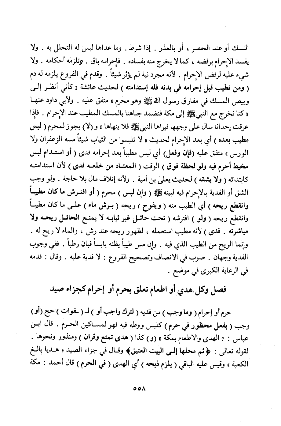 فَصْلٌ وَكُلُّ هَدْيٍ أَوْ إطْعَامٍ تَعَلَّقَ بِحَرَمٍ أَوْ إحْرَامٍ كَجَزَاءِ صَيْدِ حَرَمٍ أَوْ إحْرَامٍ (وَمَا وَجَبَ) مِنْ فِدْيَةٍ (لِتَرْكِ وَاجِبٍ أَوْ) لِ (فَوَاتِ) حَجٍّ (أَوْ) وَجَبَ (بِفِعْلٍ مَحْظُورٍ فِي حَرَمٍ) كَلُبْسٍ وَوَطْءٍ فِيهِ فَهُوَ لِمَسَاكِينِ الْحَرَمِ قَالَ ابْنُ عَبَّاسٍ: " الْهَدْيُ وَالْإِطْعَامُ بِمَكَّةَ " (وَ) كَذَا (هَدْيُ تَمَتُّعٍ وَقِرَانٍ) وَمَنْذُورٍ وَنَحْوِهَا لِقَوْلِهِ تَعَالَى: {ثُمَّ مَحِلُّهَا إلَى الْبَيْتِ الْعَتِيقِ} [الحج: ٣٣] وَقَالَ فِي جَزَاءِ الصَّيْدِ {هَدْيًا بَالِغَ الْكَعْبَةِ} [المائدة: ٩٥] وَقِيسَ عَلَيْهِ الْبَاقِي (يَلْزَمُ ذَبْحُهُ) أَيْ الْهَدْيِ (فِي الْحَرَمِ) قَالَ أَحْمَدُ: مَكَّةُ