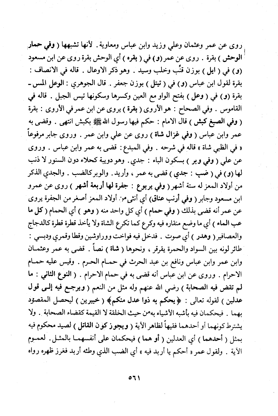 وَرُوِيَ عَنْ ابْنِ عَبَّاسٍ أَنَّهُ قَضَى بِهِ فِي حَمَامِ الْإِحْرَامِ (النَّوْعُ الثَّانِي: مَا لَمْ تَقْضِ فِيهِ الصَّحَابَةُ) رَضِيَ اللَّهُ عَنْهُمْ وَلَهُ مِثْلٌ مِنْ النَّعَمِ (وَيُرْجَعُ فِيهِ إلَى قَوْلِ عَدْلَيْنِ) لِقَوْلِهِ تَعَالَى: {يَحْكُمُ بِهِ ذَوَا عَدْلٍ مِنْكُمْ} [المائدة: ٩٥] (خَبِيرَيْنِ) لِيَحْصُلَ الْمَقْصُودُ بِهِمَا فَيَحْكُمَانِ فِيهِ بِأَشْبَهِ الْأَشْيَاءِ بِهِ مِنْ حَيْثُ الْخِلْقَةُ لَا الْقِيمَةُ كَقَضَاءِ الصَّحَابَةِ وَلَا يُشْتَرَطُ كَوْنُهُمَا أَوْ أَحَدِهِمَا فَقِيهًا لِظَاهِرِ الْآيَةِ