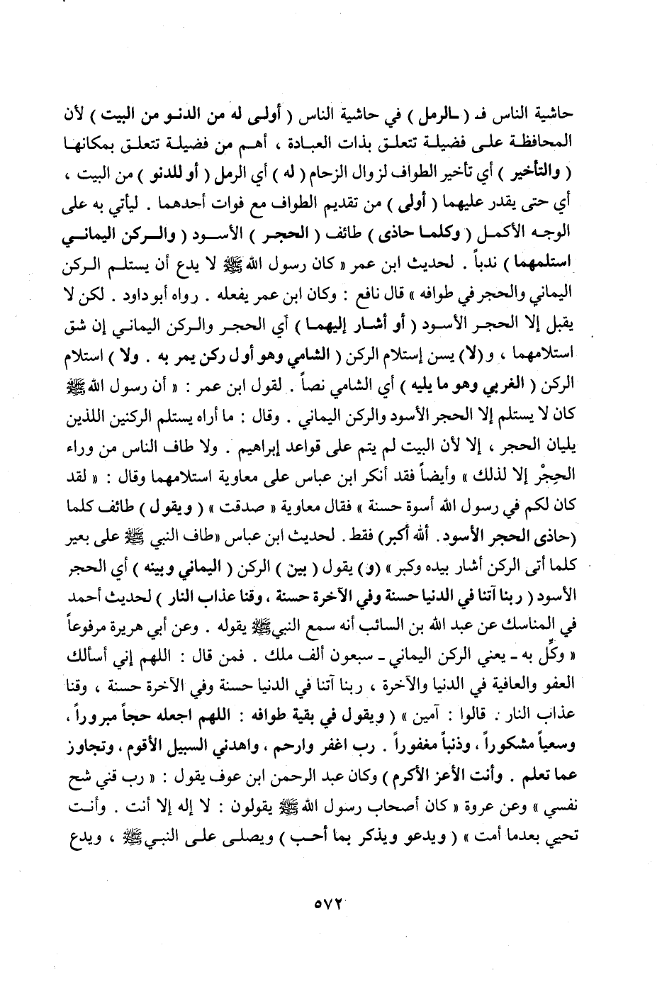 وَعَنْ أَبِي هُرَيْرَةَ مَرْفُوعًا «وُكِّلَ بِهِ - يَعْنِي الرُّكْنَ الْيَمَانِيَّ - سَبْعُونَ أَلْفَ مَلَكٍ فَمَنْ قَالَ: اللَّهُمَّ إنِّي أَسْأَلُك الْعَفْوَ وَالْعَافِيَةَ فِي الدُّنْيَا وَالْآخِرَةِ، رَبَّنَا آتِنَا فِي الدُّنْيَا حَسَنَةً وَفِي الْآخِرَةِ حَسَنَةً، وَقِنَا عَذَابَ النَّارِ قَالُوا: آمِينَ» (وَيَقُولُ فِي بَقِيَّةِ طَوَافِهِ: اللَّهُمَّ اجْعَلْهُ حَجًّا مَبْرُورًا، وَسَعْيًا مَشْكُورًا وَذَنْبًا مَغْفُورًا رَبِّ اغْفِرْ وَارْحَمْ وَاهْدِنِي السَّبِيلَ الْأَقْوَمَ وَتَجَاوَزْ عَمَّا تَعْلَمُ وَأَنْتَ الْأَعَزُّ الْأَكْرَمُ) وَكَانَ عَبْدُ الرَّحْمَنِ بْنُ عَوْفٍ يَقُولُ: " رَبِّ قِنِي شُحَّ نَفْسِي " وَعَنْ عُرْوَةَ «كَانَ أَصْحَابُ رَسُولِ اللَّهِ صَلَّى اللَّهُ عَلَيْهِ وَسَلَّمَ يَقُولُونَ: لَا إلَهَ إلَّا أَنْتَ وَأَنْتَ تُحْيِي بَعْدَ مَا أَمَتَّ» (وَيَدْعُو وَيَذْكُرُ بِمَا أَحَبَّ) وَيُصَلِّي عَلَى النَّبِيِّ صَلَّى اللَّهُ عَلَيْهِ وَسَلَّمَ وَيَدَعُ
