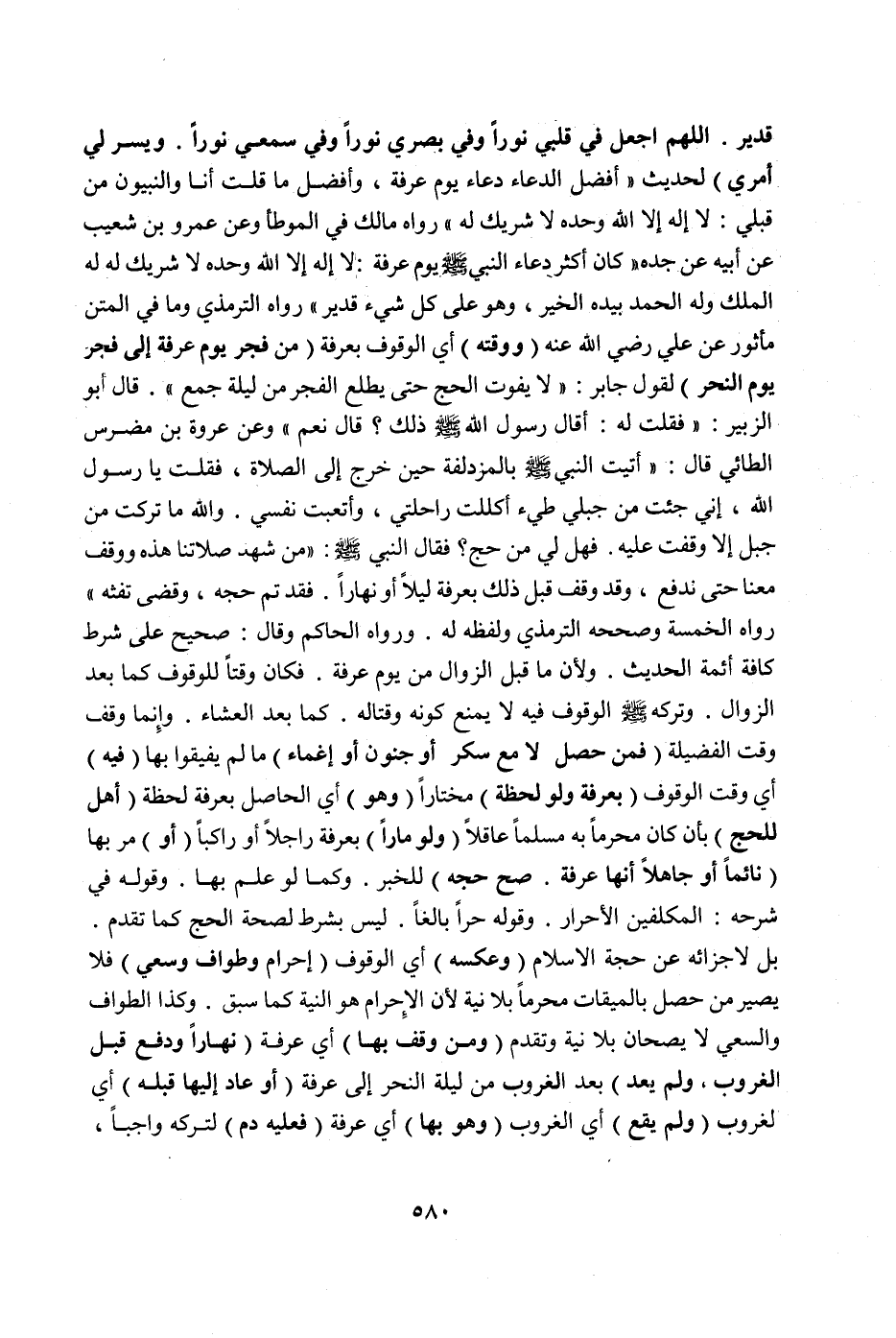 وَعَنْ عَمْرِو بْنِ شُعَيْبٍ عَنْ أَبِيهِ عَنْ جَدِّهِ «كَانَ أَكْثَرُ دُعَاءِ النَّبِيِّ صَلَّى اللَّهُ عَلَيْهِ وَسَلَّمَ يَوْمَ عَرَفَةَ: لَا إلَهَ إلَّا اللَّهُ وَحْدَهُ لَا شَرِيكَ لَهُ لَهُ الْمُلْكُ وَلَهُ الْحَمْدُ بِيَدِهِ الْخَيْرُ، وَهُوَ عَلَى كُلِّ شَيْءٍ قَدِيرٌ» رَوَاهُ التِّرْمِذِيُّ وَمَا فِي الْمَتْنِ مَأْثُورٌ عَنْ عَلِيٍّ رَضِيَ اللَّهُ عَنْهُ (وَوَقْتُهُ) أَيْ الْوُقُوفِ بِعَرَفَةَ (مِنْ فَجْرِ يَوْمِ عَرَفَةَ إلَى فَجْرِ يَوْمِ النَّحْرِ) لِقَوْلِ جَابِرٍ: «لَا يَفُوتُ الْحَجُّ حَتَّى يَطْلُعَ الْفَجْرُ مِنْ لَيْلَةِ جَمْعٍ قَالَ أَبُو الزُّبَيْرِ: فَقُلْت لَهُ: أَقَالَ رَسُولُ اللَّهِ صَلَّى اللَّهُ عَلَيْهِ وَسَلَّمَ ذَلِكَ؟ قَالَ نَعَمْ» وَعَنْ عُرْوَةَ بْنِ مُضَرِّسٍ الطَّائِيِّ قَالَ: «أَتَيْتُ النَّبِيَّ صَلَّى اللَّهُ عَلَيْهِ وَسَلَّمَ بِالْمُزْدَلِفَةِ حِينَ خَرَجَ إلَى الصَّلَاةِ، فَقُلْتُ يَا رَسُولَ اللَّهِ، إنِّي جِئْتُ مِنْ جَبَلَيْ طيئ أَكْلَلْتُ رَاحِلَتِي، وَأَتْعَبْتُ نَفْسِي وَاَللَّهِ مَا تَرَكْتُ مِنْ جَبَلٍ إلَّا وَقَفْتُ عَلَيْهِ فَهَلْ لِي مِنْ حَجٍّ؟ فَقَالَ النَّبِيُّ صَلَّى اللَّهُ عَلَيْهِ وَسَلَّمَ: مَنْ شَهِدَ صَلَاتَنَا هَذِهِ وَوَقَفَ مَعَنَا حَتَّى نَدْفَعَ، وَقَدْ وَقَفَ قَبْلَ ذَلِكَ بِعَرَفَةَ لَيْلًا أَوْ نَهَارًا فَقَدْ أَتَمَّ حَجَّهُ، وَقَضَى تَفَثَهُ» رَوَاهُ الْخَمْسَةُ وَصَحَّحَهُ التِّرْمِذِيُّ وَلَفْظُهُ لَهُ