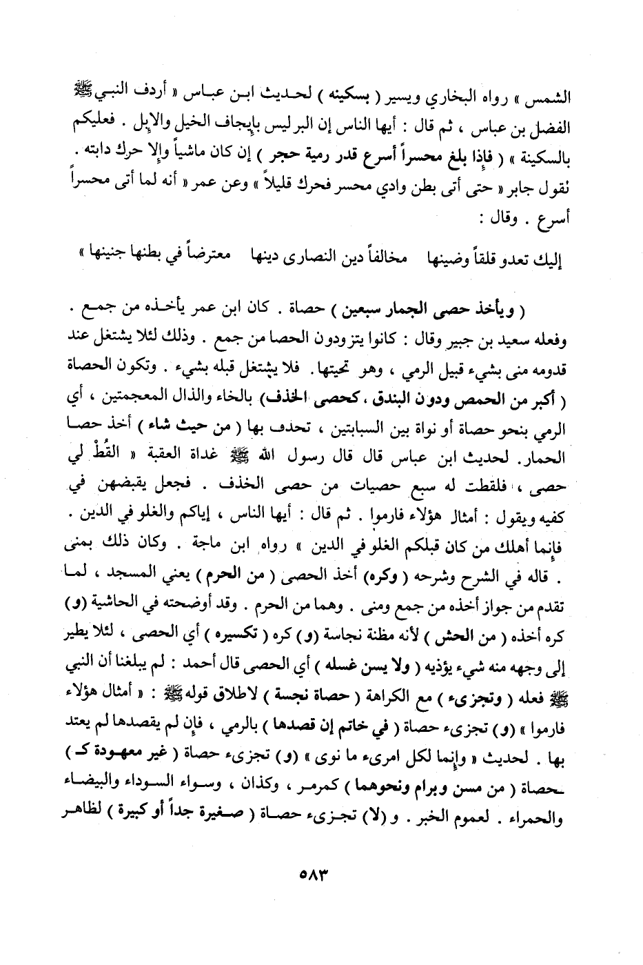(وَيَأْخُذُ حَصَى الْجِمَارِ سَبْعِينَ) حَصَاةً كَانَ ابْنُ عُمَرَ يَأْخُذُهُ مِنْ جَمْعٍ وَفَعَلَهُ سَعِيدُ بْنُ جُبَيْرٍ وَقَالَ: كَانُوا يَتَزَوَّدُونَ الْحَصَا مِنْ جَمْعٍ وَذَلِكَ لِئَلَّا يَشْتَغِلَ عِنْدَ قُدُومِهِ مِنًى بِشَيْءٍ قُبَيْلَ الرَّمْيِ، وَهُوَ تَحِيَّتُهَا فَلَا يَشْتَغِلُ قَبْلَهُ بِشَيْءٍ وَتَكُونُ الْحَصَاةُ (أَكْبَرَ مِنْ الْحِمَّصِ وَدُونَ الْبُنْدُقِ كَحَصَى الْخَذْفِ) بِالْخَاءِ وَالذَّالِ الْمُعْجَمَتَيْنِ، أَيْ الرَّمْيِ بِنَحْوِ حَصَاةٍ أَوْ نَوَاةٍ بَيْنَ السَّبَّابَتَيْنِ، تَخْذِفُ بِهَا (مِنْ حَيْثُ شَاءَ) أَخَذَ حَصَى الْجِمَارِ لِحَدِيثِ ابْنِ عَبَّاسٍ قَالَ «قَالَ رَسُولُ اللَّهِ صَلَّى اللَّهُ عَلَيْهِ وَسَلَّمَ غَدَاةَ الْعَقَبَةِ اُلْقُطْ لِي حَصًى، فَلَقَطْت لَهُ سَبْعَ حَصَيَاتٍ مِنْ حَصَى الْخَذْفِ فَجَعَلَ يَقْبِضُهُنَّ فِي كَفَّيْهِ وَيَقُولُ: أَمْثَالُ هَؤُلَاءِ فَارْمُوا ثُمَّ قَالَ: أَيُّهَا النَّاسُ، إيَّاكُمْ وَالْغُلُوَّ فِي الدِّينِ فَإِنَّمَا أَهْلَكَ مَنْ كَانَ قَبْلَكُمْ الْغُلُوُّ فِي الدِّينِ» رَوَاهُ ابْنُ مَاجَهْ وَكَانَ ذَلِكَ بِمِنًى قَالَهُ فِي الشَّرْحِ وَشَرْحِهِ (وَكُرِهَ) أَخْذُ الْحَصَى (مِنْ الْحَرَمِ) يَعْنِي الْمَسْجِدَ، لِمَا تَقَدَّمَ مِنْ جَوَازِ أَخْذِهِ مِنْ جَمْعٍ وَمِنًى وَهُمَا مِنْ الْحَرَمِ وَقَدْ أَوْضَحْته فِي الْحَاشِيَةِ (وَ) كُرِهَ أَخْذُهُ (مِنْ الْحُشِّ) لِأَنَّهُ مَظِنَّةُ نَجَاسَةٍ