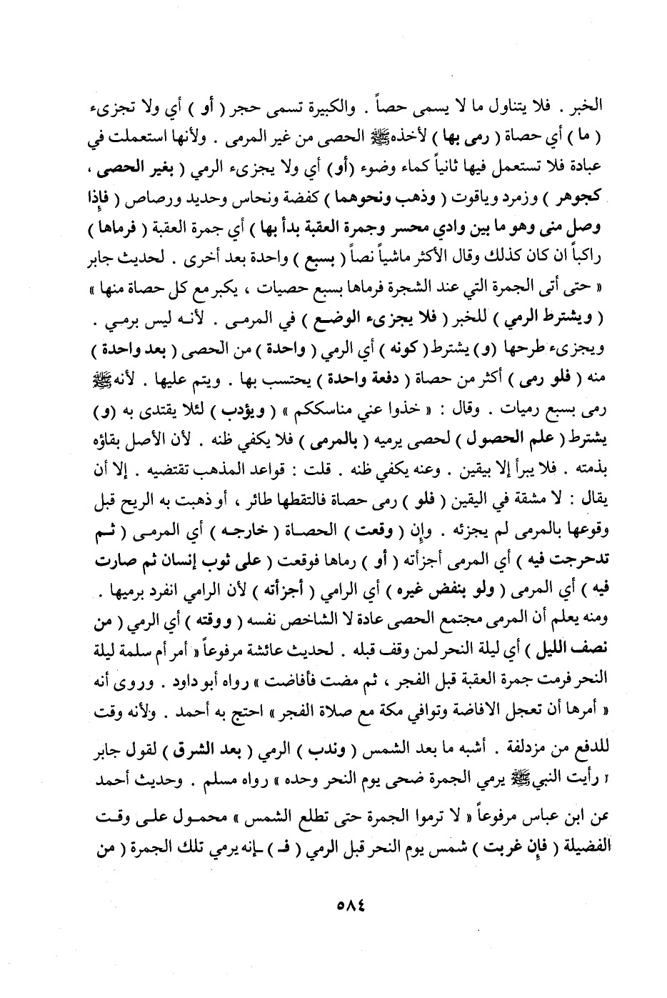 وَرُوِيَ أَنَّهُ «أَمَرَهَا أَنْ تُعَجِّلَ الْإِفَاضَةَ وَتُوَافِيَ مَكَّةَ مَعَ صَلَاةِ الْفَجْرِ» احْتَجَّ بِهِ أَحْمَدُ وَلِأَنَّهُ وَقْتٌ لِلدَّفْعِ مِنْ مُزْدَلِفَةَ أَشْبَهَ مَا بَعْدَ الشَّمْسِ (وَنُدِبَ) الرَّمْيُ (بَعْدَ الشَّرْقِ) لِقَوْلِ جَابِرٍ «رَأَيْت النَّبِيَّ صَلَّى اللَّهُ عَلَيْهِ وَسَلَّمَ يَرْمِي الْجَمْرَةَ ضُحَى يَوْمِ النَّحْرِ وَحْدَهُ» رَوَاهُ مُسْلِمٌ وَحَدِيثِ أَحْمَدَ عَنْ ابْنِ عَبَّاسٍ مَرْفُوعًا «لَا تَرْمُوا الْجَمْرَةَ حَتَّى تَطْلُعَ الشَّمْسُ» مَحْمُولٌ عَلَى وَقْتِ الْفَضِيلَةِ