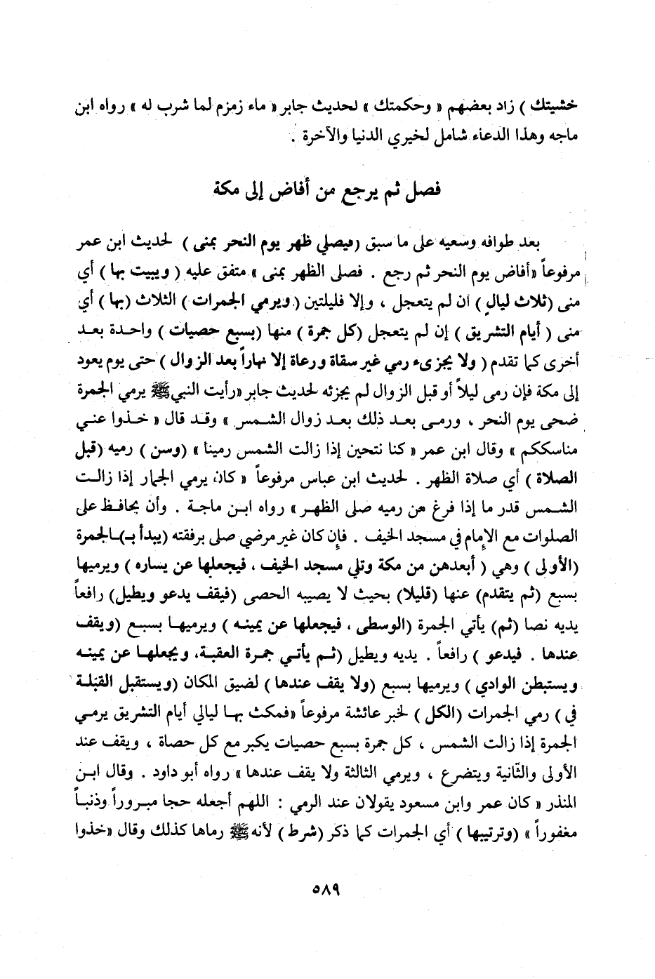 فَصْلٌ: ثُمَّ يَرْجِعُ مَنْ أَفَاضَ إلَى مَكَّةَ بَعْدَ طَوَافِهِ وَسَعْيِهِ عَلَى مَا سَبَقَ (فَيُصَلِّي ظُهْرَ يَوْمَ النَّحْرِ بِمِنًى) لِحَدِيثِ ابْنِ عُمَرَ مَرْفُوعًا «أَفَاضَ يَوْمَ النَّحْرِ ثُمَّ رَجَعَ فَصَلَّى الظُّهْرَ بِمِنًى» مُتَّفَقٌ عَلَيْهِ (وَيَبِيتُ بِهَا) أَيْ مِنًى (ثَلَاثَ لَيَالٍ) إنْ لَمْ يَتَعَجَّلْ، وَإِلَّا فَلَيْلَتَيْنِ (وَيَرْمِي الْجَمَرَاتِ) الثَّلَاثَ (بِهَا) أَيْ مِنًى (أَيَّامَ التَّشْرِيقِ) إنْ لَمْ يَتَعَجَّلْ (كُلَّ جَمْرَةٍ) مِنْهَا (بِسَبْعِ حَصَيَاتٍ) وَاحِدَةٍ بَعْدَ أُخْرَى كَمَا تَقَدَّمَ (وَلَا يُجْزِئُ رَمْيُ غَيْرِ سُقَاةٍ وَرُعَاةٍ إلَّا نَهَارًا بَعْدَ الزَّوَالِ) حَتَّى يَوْمَ يَعُودُ إلَى مَكَّةَ