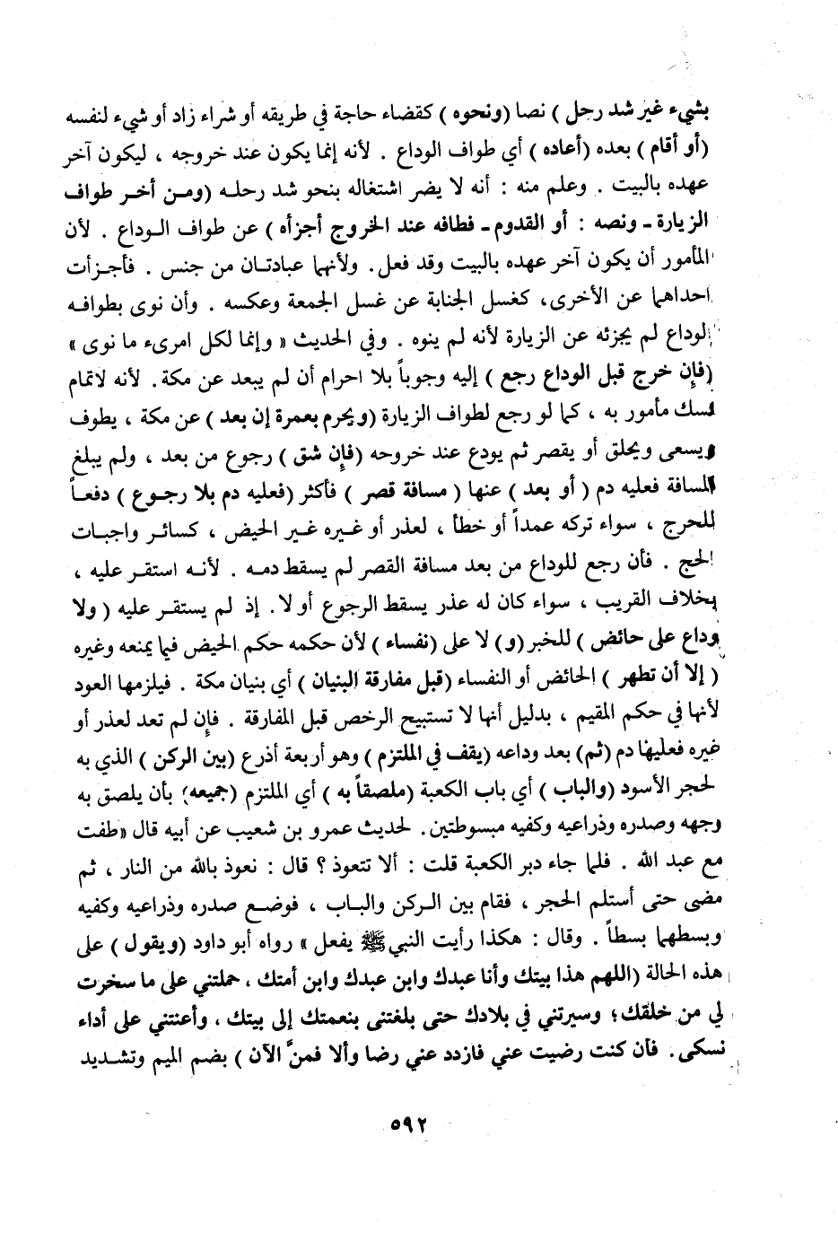 (فَإِنْ خَرَجَ قَبْلَ الْوَدَاعَ رَجَعَ) إلَيْهِ وُجُوبًا بِلَا إحْرَامٍ إنْ لَمْ يَبْعُدْ عَنْ مَكَّةَ لِأَنَّهُ لِإِتْمَامِ نُسُكٍ مَأْمُورٍ بِهِ، كَمَا لَوْ رَجَعَ لِطَوَافِ الزِّيَارَةِ (وَيُحْرِمُ بِعُمْرَةٍ إنْ بَعُدَ) عَنْ مَكَّةَ، يَطُوفُ وَيَسْعَى وَيَحْلِقُ أَوْ يُقَصِّرُ ثُمَّ يُوَدِّعُ عِنْدَ خُرُوجِهِ (فَإِنْ شَقَّ) رُجُوعٌ مِنْ بُعْدٍ، وَلَمْ يَبْلُغْ الْمَسَافَةَ فَعَلَيْهِ دَمٌ (أَوْ بَعُدَ) عَنْهَا (مَسَافَةَ قَصْرٍ) فَأَكْثَرَ (فَعَلَيْهِ دَمٌ بِلَا رُجُوعٍ) دَفْعًا لِلْحَرَجِ، سَوَاءٌ تَرَكَهُ عَمْدًا أَوْ خَطَأً، لِعُذْرٍ أَوْ غَيْرِهِ غَيْرَ الْحَيْضِ، كَسَائِرِ وَاجِبَاتِ الْحَجِّ فَإِنْ رَجَعَ لِلْوَدَاعِ مِنْ بَعْدِ مَسَافَةِ الْقَصْرِ لَمْ يُسْقِطْ دَمَهُ لِأَنَّهُ اسْتَقَرَّ عَلَيْهِ، لِخِلَافِ الْقَرِيبِ، سَوَاءٌ كَانَ لَهُ عُذْرٌ يُسْقِطُ الرُّجُوعَ أَوْ لَا إذْ لَمْ يَسْتَقِرَّ عَلَيْهِ
