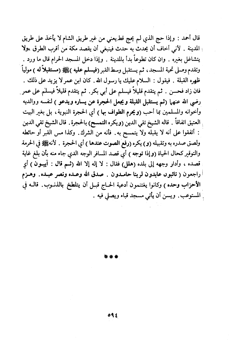 (وَ) يُكْرَهُ (رَفْعُ الصَّوْتِ عِنْدَهَا) أَيْ الْحُجْرَةِ لِأَنَّهُ صَلَّى اللَّهُ عَلَيْهِ وَسَلَّمَ فِي الْحُرْمَةِ وَالتَّوْقِيرِ كَحَالِ الْحَيَاةِ (وَإِذَا تَوَجَّهَ) أَيْ قَصَدَ الْمُسَافِرُ الْوَجْهَ الَّذِي جَاءَ مِنْهُ بِأَنْ بَلَغَ غَايَةَ قَصْدِهِ، وَأَدَارَ وَجْهَهُ إلَى بَلَدِهِ (هَلَّلَ) فَقَالَ: لَا إلَهَ إلَّا اللَّهُ (ثُمَّ قَالَ: آيِبُونَ) أَيْ رَاجِعُونَ (تَائِبُونَ عَابِدُونَ لِرَبِّنَا حَامِدُونَ صَدَقَ اللَّهُ وَعْدَهُ وَنَصَرَ عَبْدَهُ وَهَزَمَ الْأَحْزَابَ وَحْدَهُ) وَكَانُوا يَغْتَنِمُونَ أَدْعِيَةَ الْحَاجِّ قَبْلَ أَنْ يَتَلَطَّخَ بِالذُّنُوبِ قَالَهُ فِي الْمُسْتَوْعِبِ وَيَسُنُّ أَنْ يَأْتِيَ مَسْجِدَ قُبَاءَ وَيُصَلِّي فِيهِ