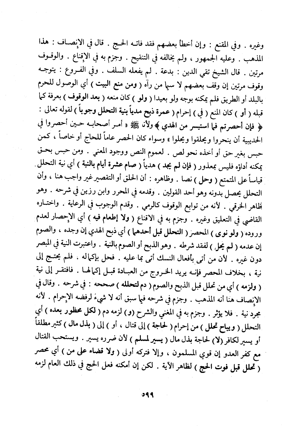 وَمَنْ حُبِسَ بِحَقٍّ يُمْكِنُهُ أَدَاؤُهُ فَلَيْسَ بِمَعْذُورٍ وَإِذَا لَمْ يَجِدْ) هَدْيًا (صَامَ عَشَرَةَ أَيَّامٍ بِالنِّيَّةِ) أَيْ نِيَّةِ التَّحَلُّلِ قِيَاسًا عَلَى الْمُتَمَتِّعِ (وَحَلَّ) نَصًّا وَظَاهِرُهُ: أَنَّ الْحَلْقَ أَوْ التَّقْصِيرَ غَيْرُ وَاجِبٍ هُنَا، وَأَنَّ التَّحَلُّلَ يَحْصُلُ بِدُونِهِ وَهُوَ أَحَدُ الْقَوْلَيْنِ وَقَدَّمَهُ فِي الْمُحَرَّرِ وَابْنُ رَزِينٍ فِي شَرْحِهِ وَهُوَ ظَاهِرُ الْخِرَقِيِّ لِأَنَّهُ مِنْ تَوَابِعِ الْوُقُوفِ كَالرَّمْيِ وَقَدَّمَ الْوُجُوبَ فِي الرِّعَايَةِ وَاخْتَارَهُ الْقَاضِي فِي التَّعْلِيقِ وَغَيْرُهُ وَجَزَمَ فِي الْإِقْنَاعِ (وَلَا إطْعَامَ فِيهِ) أَيْ الْإِحْصَارِ لِعَدَمِ وُرُودِهِ
