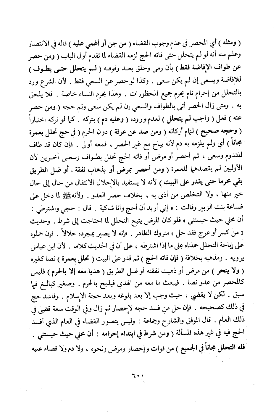 (وَمَنْ حُصِرَ عَنْ طَوَافِ الْإِفَاضَةِ فَقَطْ) بِأَنْ رَمَى وَحَلَقَ بَعْدَ وُقُوفِهِ (لَمْ يَتَحَلَّلْ حَتَّى يَطُوفَ) لِلْإِفَاضَةِ وَيَسْعَى إنْ لَمْ يَكُنْ سَعَى وَكَذَا لَوْ حُصِرَ عَنْ السَّعْيِ فَقَطْ لِأَنَّ الشَّرْعَ وَرَدَ بِالتَّحَلُّلِ مِنْ إحْرَامٍ تَامٍّ يُحَرِّمُ جَمِيعَ الْمَحْظُورَاتِ وَهَذَا يُحَرِّمُ النِّسَاءَ خَاصَّةً فَلَا يُلْحَقُ بِهِ وَمَتَى زَالَ الْحَصْرُ أَتَى بِالطَّوَافِ وَالسَّعْيِ إنْ لَمْ يَكُنْ سَعَى وَتَمَّ حَجُّهُ (وَمَنْ حُصِرَ عَنْ) فِعْلٍ (وَاجِبٍ لَمْ يَتَحَلَّلْ) لِعَدَمِ وُرُودِهِ (وَعَلَيْهِ دَمٌ) بِتَرْكِهِ كَمَا لَوْ تَرَكَهُ اخْتِيَارًا (وَحَجُّهُ صَحِيحٌ) لِتَمَامِ أَرْكَانِهِ