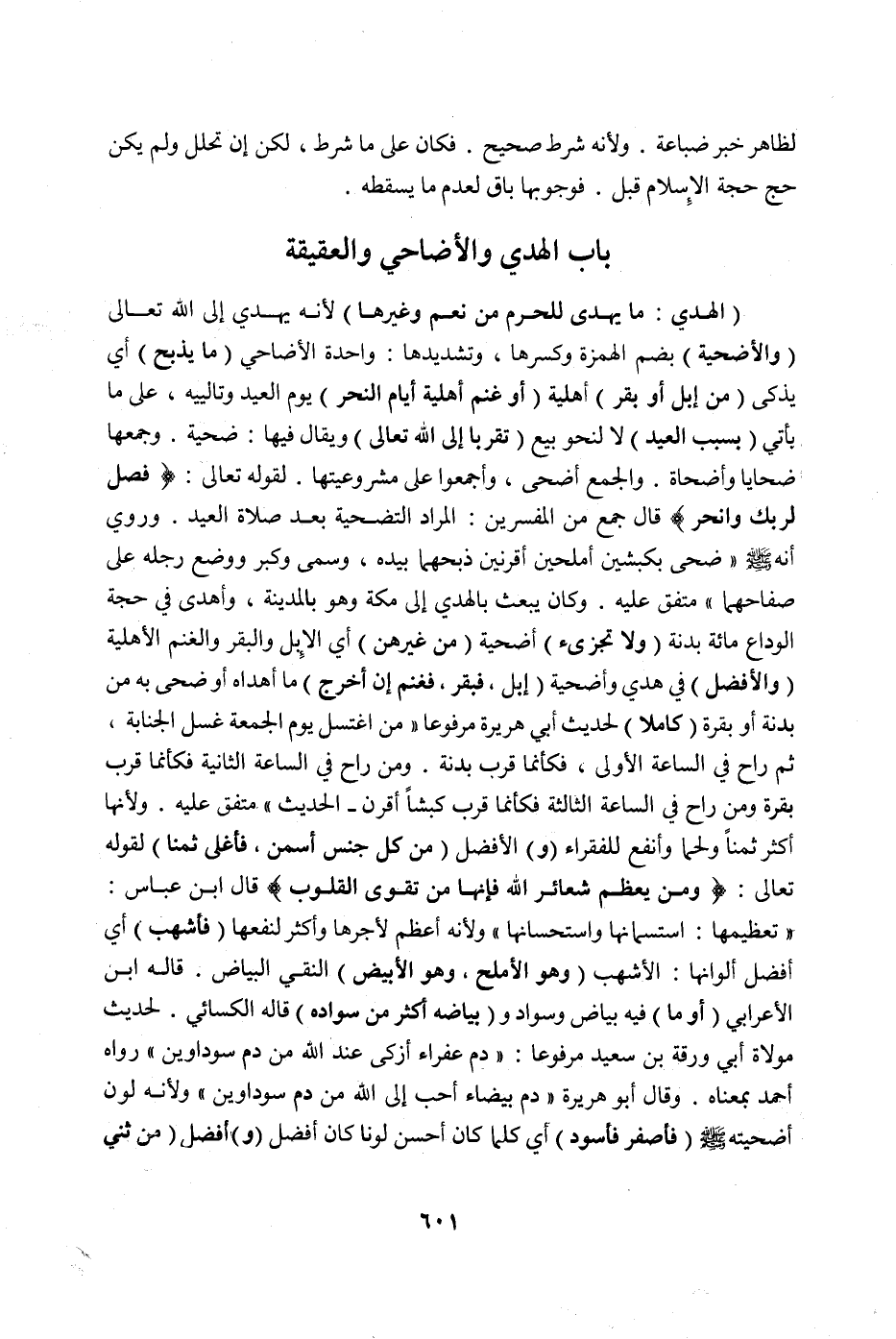 ِ (الْهَدْيُ: مَا يُهْدَى لِلْحَرَمِ مِنْ نَعَمٍ وَغَيْرِهَا) لِأَنَّهُ يُهْدَى إلَى اللَّهِ تَعَالَى (وَالْأُضْحِيَّةُ) بِضَمِّ الْهَمْزَةِ وَكَسْرِهَا، وَتَشْدِيدِهَا: وَاحِدَةُ الْأَضَاحِيِّ (مَا يُذْبَحُ) أَيْ يُذَكَّى (مِنْ إبِلٍ أَوْ بَقَرٍ) أَهْلِيَّةٍ (أَوْ غَنَمٍ أَهْلِيَّةٍ أَيَّامَ النَّحْرِ) يَوْمَ الْعِيدِ وَتَالِيَيْهِ، عَلَى مَا يَأْتِي (بِسَبَبِ الْعِيدِ) لَا لِنَحْوِ بَيْعٍ (تَقَرُّبًا إلَى اللَّهِ تَعَالَى) وَيُقَالُ فِيهَا: ضَحِيَّةٌ. وَجَمْعُهَا ضَحَايَا وَأَضْحَاةٌ. وَالْجَمْعُ أَضْحَى، وَأَجْمَعُوا عَلَى مَشْرُوعِيَّتِهَا لِقَوْلِهِ تَعَالَى {فَصَلِّ لِرَبِّك وَانْحَرْ} [الكوثر: ٢] قَالَ جَمْعٌ مِنْ الْمُفَسِّرِينَ: الْمُرَادُ التَّضْحِيَةُ بَعْدَ صَلَاةِ الْعِيدِ. وَرُوِيَ أَنَّهُ صَلَّى اللَّهُ عَلَيْهِ وَسَلَّمَ «ضَحَّى بِكَبْشَيْنِ أَمْلَحَيْنِ أَقَرْنَيْنِ ذَبَحَهُمَا بِيَدِهِ، وَسَمَّى وَكَبَّرَ وَوَضَعَ رِجْلَهُ عَلَى صِفَاحِهِمَا» مُتَّفَقٌ عَلَيْهِ. وَكَانَ يَبْعَثُ بِالْهَدْيِ إلَى مَكَّةَ وَهُوَ بِالْمَدِينَةِ، وَأَهْدَى فِي حِجَّةِ الْوَدَاعِ مِائَةَ بَدَنَةٍ.