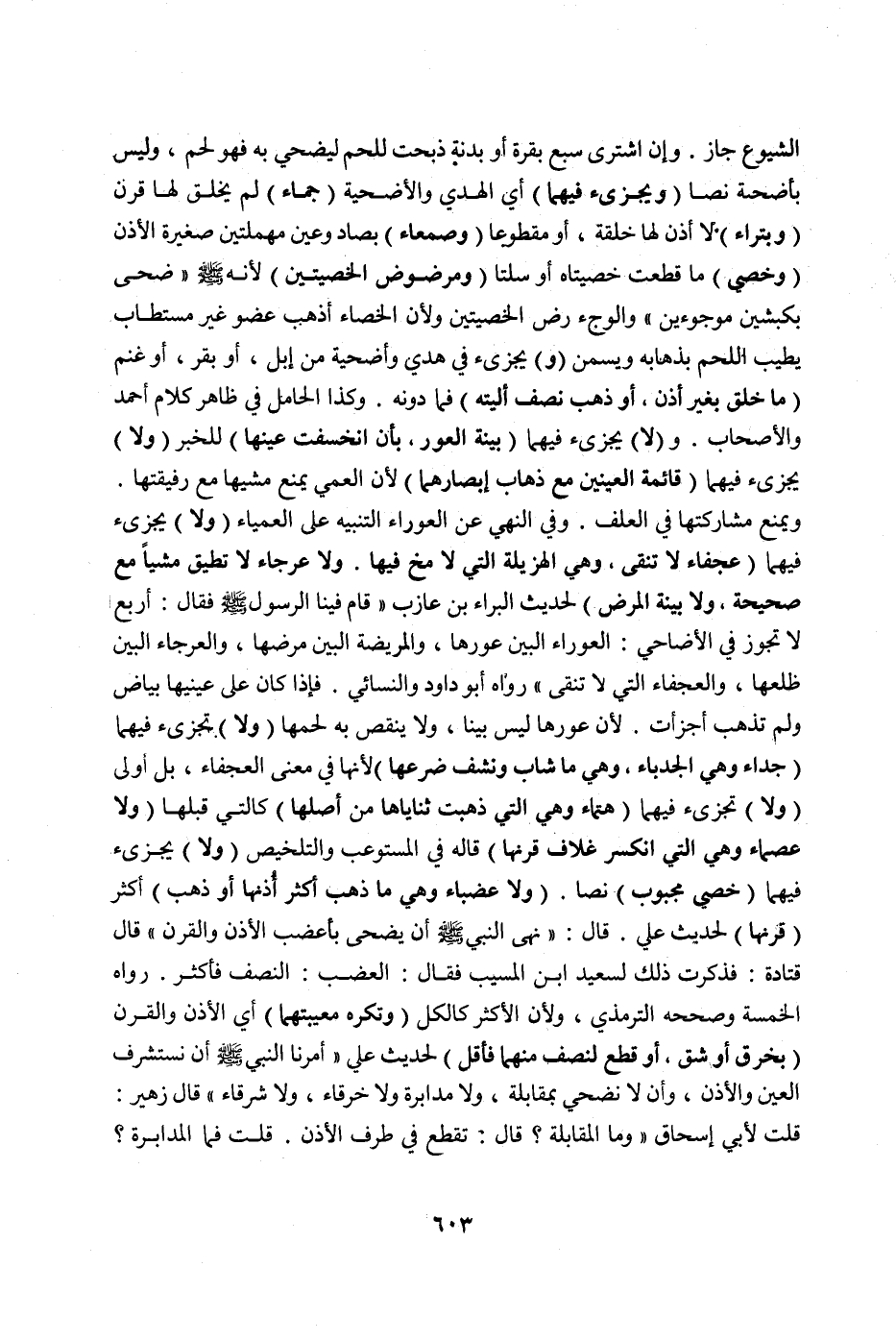 (وَ) يُجْزِئُ فِي هَدْيٍ وَأُضْحِيَّةٍ مِنْ إبِلٍ، أَوْ بَقَرٍ، أَوْ غَنَمٍ (مَا خُلِقَ بِغَيْرِ أُذُنٍ، أَوْ ذَهَبَ نِصْفُ أَلْيَتِهِ) فَمَا دُونَهُ. وَكَذَا الْحَامِلُ فِي ظَاهِرِ كَلَامِ أَحْمَدَ وَالْأَصْحَابِ. وَ (لَا) يُجْزِئُ فِيهِمَا (بَيِّنَةُ الْعَوَرِ، بِأَنْ انْخَسَفَ عَيْنُهَا) لِلْخَبَرِ (وَلَا) يُجْزِئُ فِيهِمَا (قَائِمَةُ الْعَيْنَيْنِ مَعَ ذَهَابِ إبْصَارِهِمَا) لِأَنَّ الْعَمَى يَمْنَعُ مِشْيَتَهَا مَعَ رَفِيقَتِهَا. وَيَمْنَعُ مُشَارَكَتَهَا فِي الْعَلَفِ. وَفِي النَّهْيِ عَنْ الْعَوْرَاءِ التَّنْبِيهُ عَلَى الْعَمْيَاءِ (وَلَا) يُجْزِئُ فِيهِمَا (عَجْفَاءُ لَا تَنْقَى، وَهِيَ الْهَزِيلَةُ الَّتِي لَا مُخَّ فِيهَا. وَلَا عَرْجَاءُ لَا تُطِيقُ مَشْيًا مَعَ صَحِيحَةٍ، وَلَا بَيِّنَةُ الْمَرَضِ) لِحَدِيثِ الْبَرَاءِ بْنِ عَازِبٍ " «قَامَ فِينَا الرَّسُولُ صَلَّى اللَّهُ عَلَيْهِ وَسَلَّمَ فَقَالَ: أَرْبَعٌ لَا تَجُوزُ فِي الْأَضَاحِيِّ: الْعَوْرَاءُ الْبَيِّنُ عَوَرُهَا، وَالْمَرِيضَةُ الْبَيِّنُ مَرَضُهَا، وَالْعَرْجَاءُ الْبَيِّنُ ظَلَعُهَا، وَالْعَجْفَاءُ الَّتِي لَا تُنْقِيَ» رَوَاهُ أَبُو دَاوُد وَالنَّسَائِيُّ.