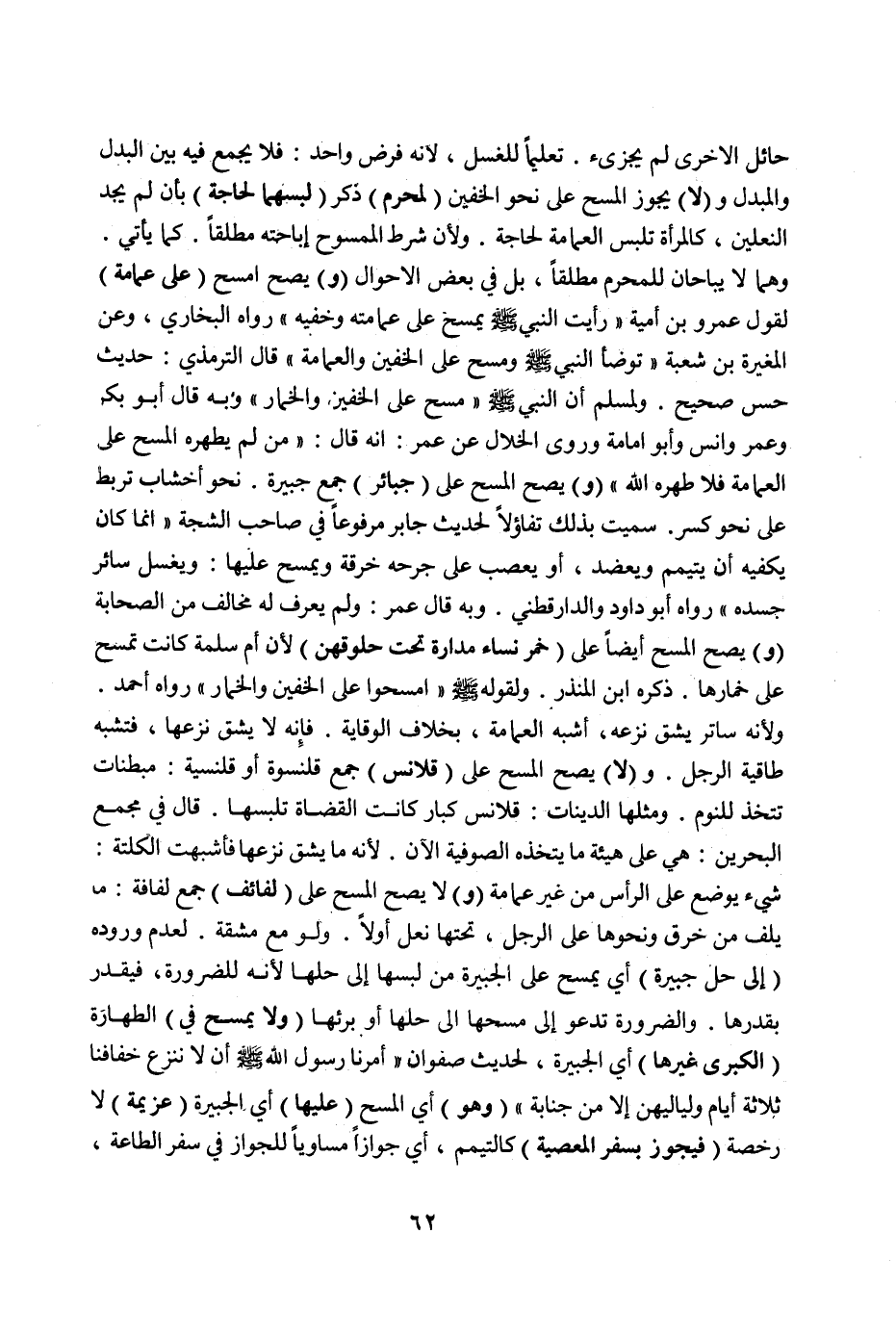 (وَلَا يَمْسَحُ فِي) الطَّهَارَةِ (الْكُبْرَى غَيْرَهَا) أَيْ الْجَبِيرَةَ، لِحَدِيثِ «صَفْوَانَ أَمَرَنَا رَسُولُ اللَّهِ صَلَّى اللَّهُ عَلَيْهِ وَسَلَّمَ أَنْ لَا نَنْزِعَ خِفَافَنَا ثَلَاثَةَ أَيَّامٍ وَلَيَالِيِهِنَّ إلَّا مِنْ جَنَابَةٍ» (وَهُوَ) أَيْ الْمَسْحُ (عَلَيْهَا) أَيْ الْجَبِيرَةِ (عَزِيمَةٌ) لَا رُخْصَةٌ (فَيَجُوزُ بِسَفَرِ الْمَعْصِيَةِ) كَالتَّيَمُّمِ، أَيْ جَوَازًا مُسَاوِيًا لِلْجَوَازِ فِي سَفَرِ الطَّاعَةِ،