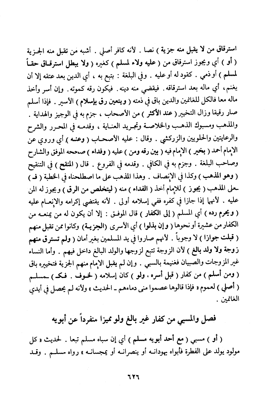 فَصْلٌ وَالْمَسْبِيُّ مِنْ كُفَّارٍ غَيْرُ بَالِغٍ وَلَوْ مُمَيِّزًا مُنْفَرِدًا عَنْ أَبَوَيْهِ (أَوْ) مَسْبِيٍّ (مَعَ أَحَدِ أَبَوَيْهِ مُسْلِمٌ) أَيْ إنْ سَبَاهُ مُسْلِمٌ تَبَعًا. لِحَدِيثِ «كُلُّ مَوْلُودٍ يُولَدُ عَلَى الْفِطْرَةِ فَأَبَوَاهُ يُهَوِّدَانِهِ أَوْ يُنَصِّرَانِهِ أَوْ يُمَجِّسَانِهِ» رَوَاهُ مُسْلِمٌ. وَقَدْ